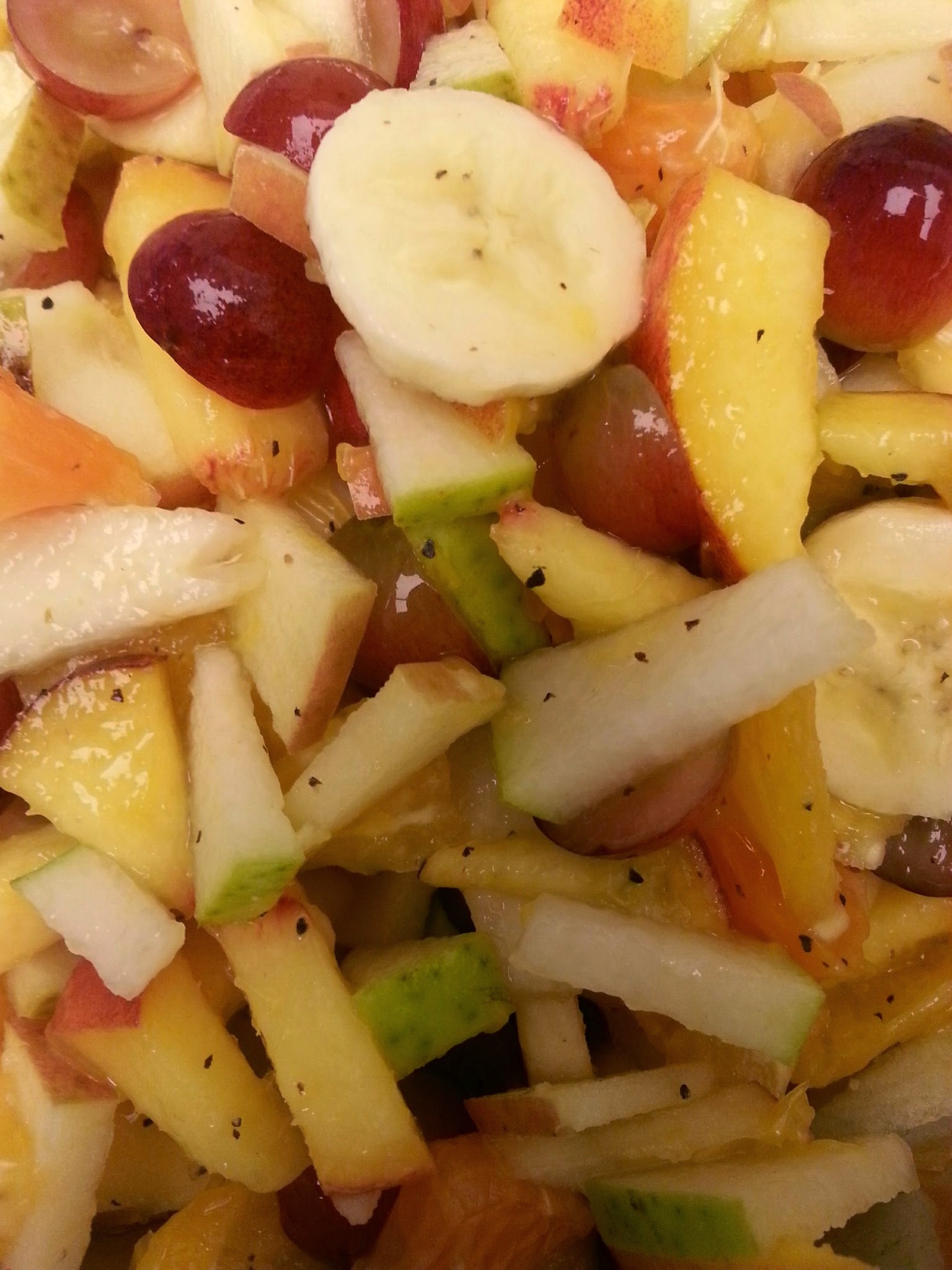 Ingredients: Apple, Grapes, Banana, Pear, Yellow Peach, Tangerines & Oranges, salt , black pepper, lemon juice