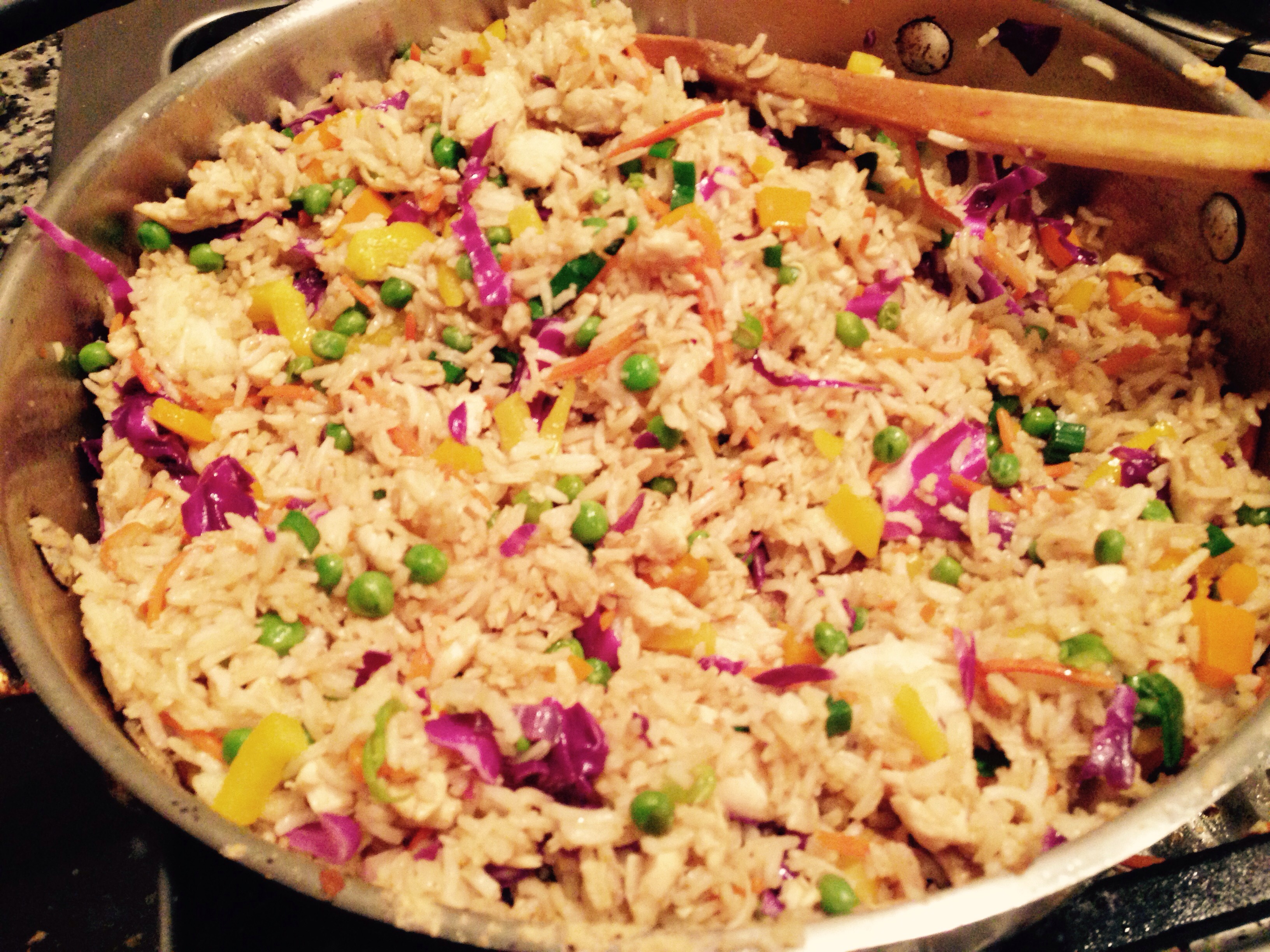 Had leftover veggies (just a bit of each) and some leftover plain chawal so I made chicken fried rice