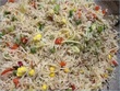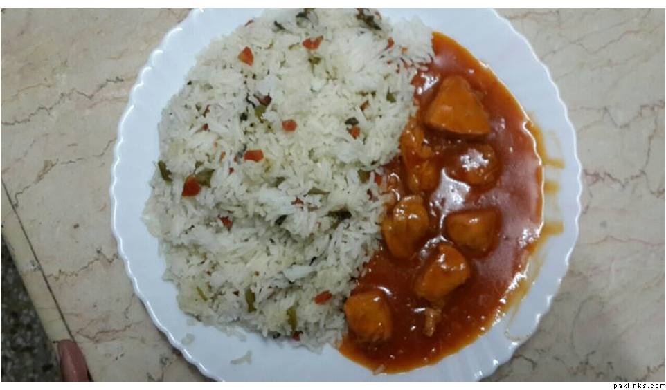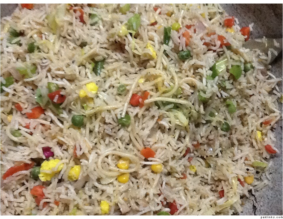 Whisk one or two eggs with 1tsp of sugar and 1/4 tsp of yellow food color, stir fry and keep aside. Sauté spring/green onion, add in boneless chicken and fry. Add in salt, black pepper, Chinese salt, soya sauce, vinegar. Now add in the veggies... Capsicum, cabbage, carrot, boiled peas and stir fry only for half a minute. Add in noodles(break them into 3 halves and boil), sweet corns and boiled rice, fried eggs and stir fry. Add more salt if you need. Add in soy sauce and green part of spring onions. Steam for 1-2 minutes.