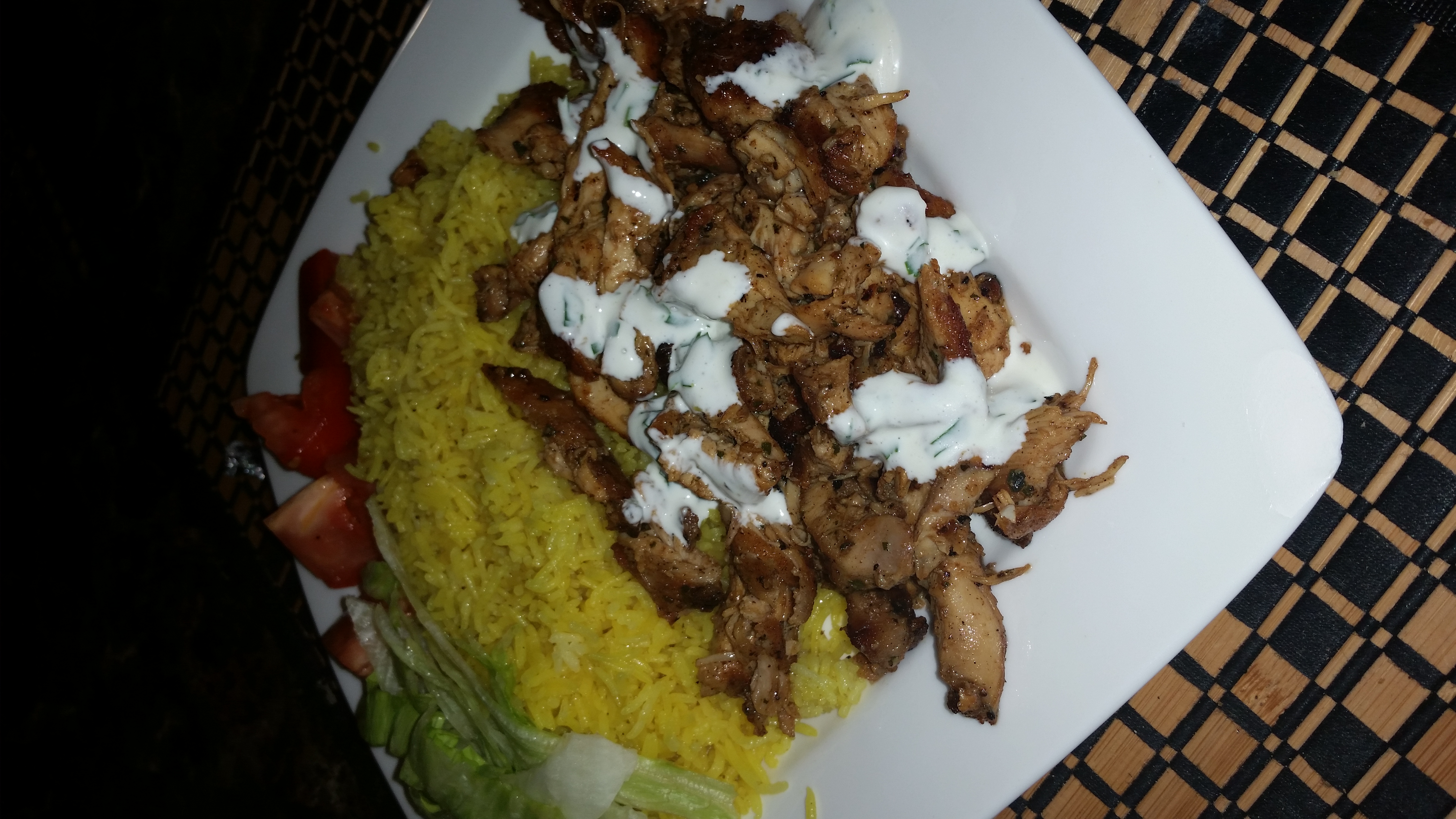 I followed the recipe for the chicken as written. Some adjustments that i made, that i think made it yummier: I sauteed one chopped onion and 2 cloves of crushed garlic along sith the rest of the stuff for the rice…and the rest i kept the same. And for the white sauce i did not use that much sugar, added a clove of crushed garlic.. salt/bp and olive oil. Oh and a bit of tahini. The white sauce turned out to be amazing.