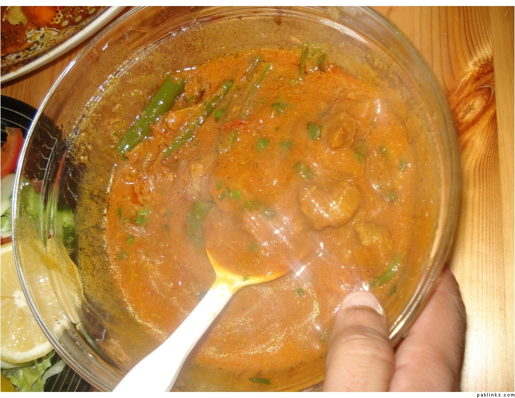 sorry 4 replying late sunset eyez...i waz out of country...well 1st think is i use kashmiri mirch as i said...n for giving ur salans perfect color rather than dark brown do not over fry onions...just fry them till they are slightly brown n golden....for making korma yes den u havto fry them till dark brown...but in salan add in meat as soon as they turn slightly brown cuz while frying meat, onions get more darker in color cuz onions r also being fried along with the meat...n yeah 4 that tomato pieces...never ever cook meat in a pressure cooker...cuz it makes the meat tender soon but onions n tomatoes dun get enuff tym to dissolve in the salan...n add in tomatoes with the meat not at the tym of bhooning...cuz sum ppl do so...but if still ur having problem then blend the tomatoes and add in...taste will be equally gud...but ofcourse tiny pieces of tomatoes n onions r alwayz there no matter how much u bhoonify it...