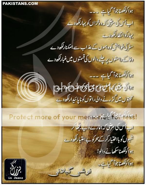 meri baynoor AankhouN kay khazaanay maiN chuppay har khwaab kee takmeel kar day gee :-)