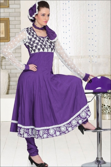 Its a georgette white A-line kameez (which has some purple embroidery on it) and straight leg trouser (in purple).