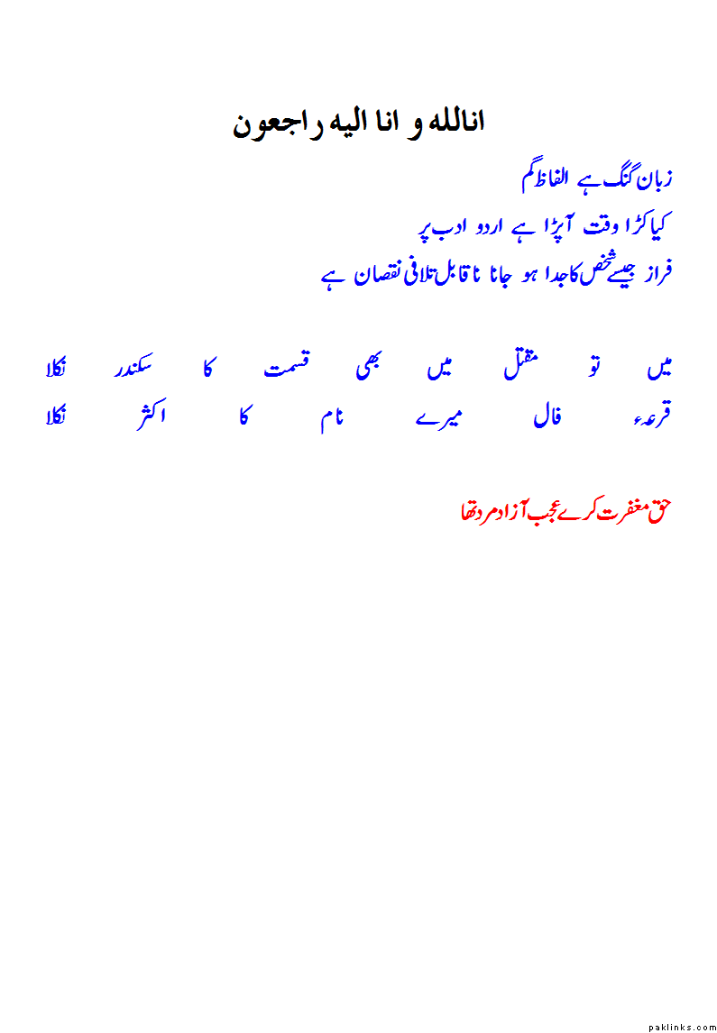 May Allah rest Ahmad Faraz's Soul in Jannah and bless him.