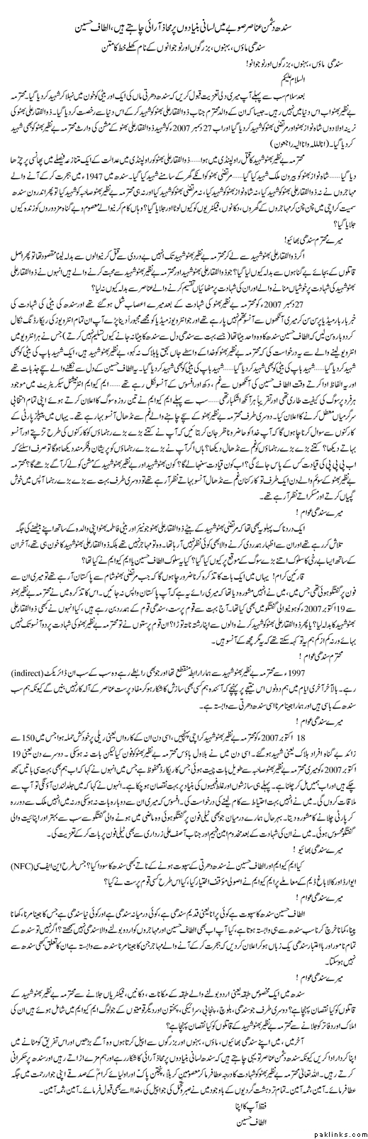 In a rejoinder to Mr Hussain in the shape of an open letter, the Sindh Democratic Forum, which represents intellectuals, writers and concerned citizens of the province, pointed out that while the entire country, especially Sindh, was in mourning over the death of Ms Benazir Bhutto, and while there was widespread anguish among the democratic and progressive people of Pakistan about the role of the military establishment, Mr Hussain’s letter had raised more doubts and apprehensions.The convener and the secretary of SDF, Abrar Kazi and Zulfiqar Halepoto respectively, said that the people of Sindh had reacted on an unprecedented scale over Ms Bhutto’s assassination irrespective of ethnicity and language, but Altaf Hussain’s letter had kicked up “petty matters” which were bound to be used by the enemies of Sindh to widen the gulf between the people.