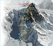 An image created using satellite measurements shows the expedition’s key camps along K2’s North Ridge route, which follows the steep fin of rock and snow to the so-called Japanese Couloir, a gorge just below the summit. The route was first scaled in 1982, by a Japanese expedition. K2 takes its name from the 1856 survey notes of British explorer T. G. Montgomerie: “K” for Karakoram, a subrange of the Himalaya, and “2” for the second peak he noted on the horizon.