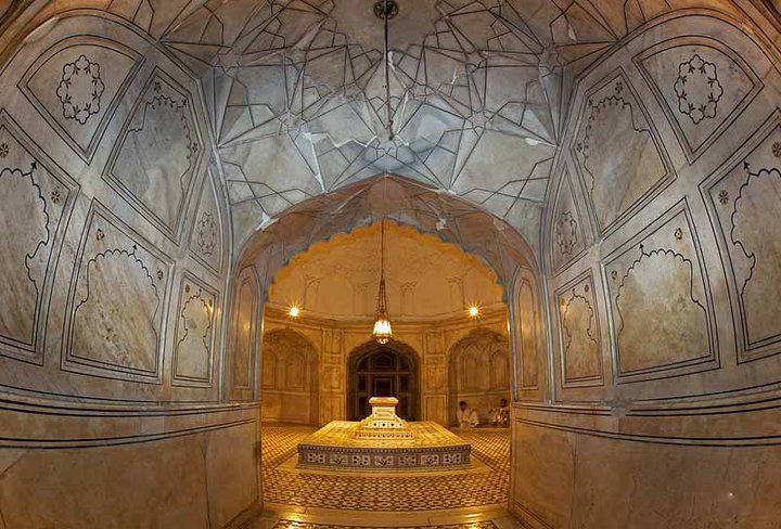 “The mausoleum is located near the town of Shahdara Bagh in Lahore, Pakistan. His son Shah Jahan built the mausoleum 10 years after his father’s death. It is sited in an attractive walled garden. It has four 30 meter high minarets. The interior is embellished with frescoes and pietra dura inlay and coloured marble. The mausoleum features prominently on the Pakistan Rupees 1,000 denomination bank note. The entrance to the mausoleum is through two massive gateways of stone and masonry opposite each other (to the north and south) which lead to a square enclosure known as the Akbari Serai.”