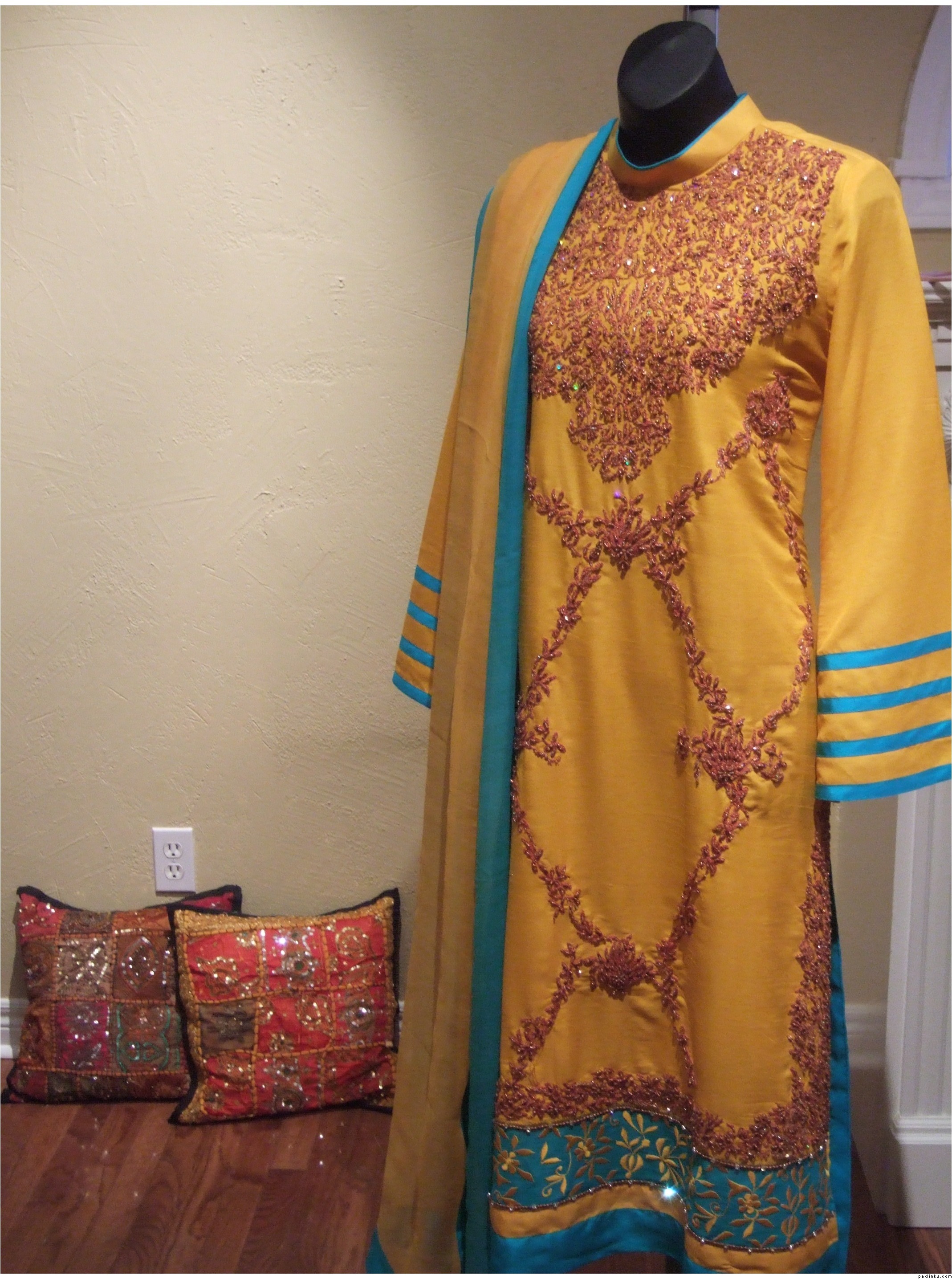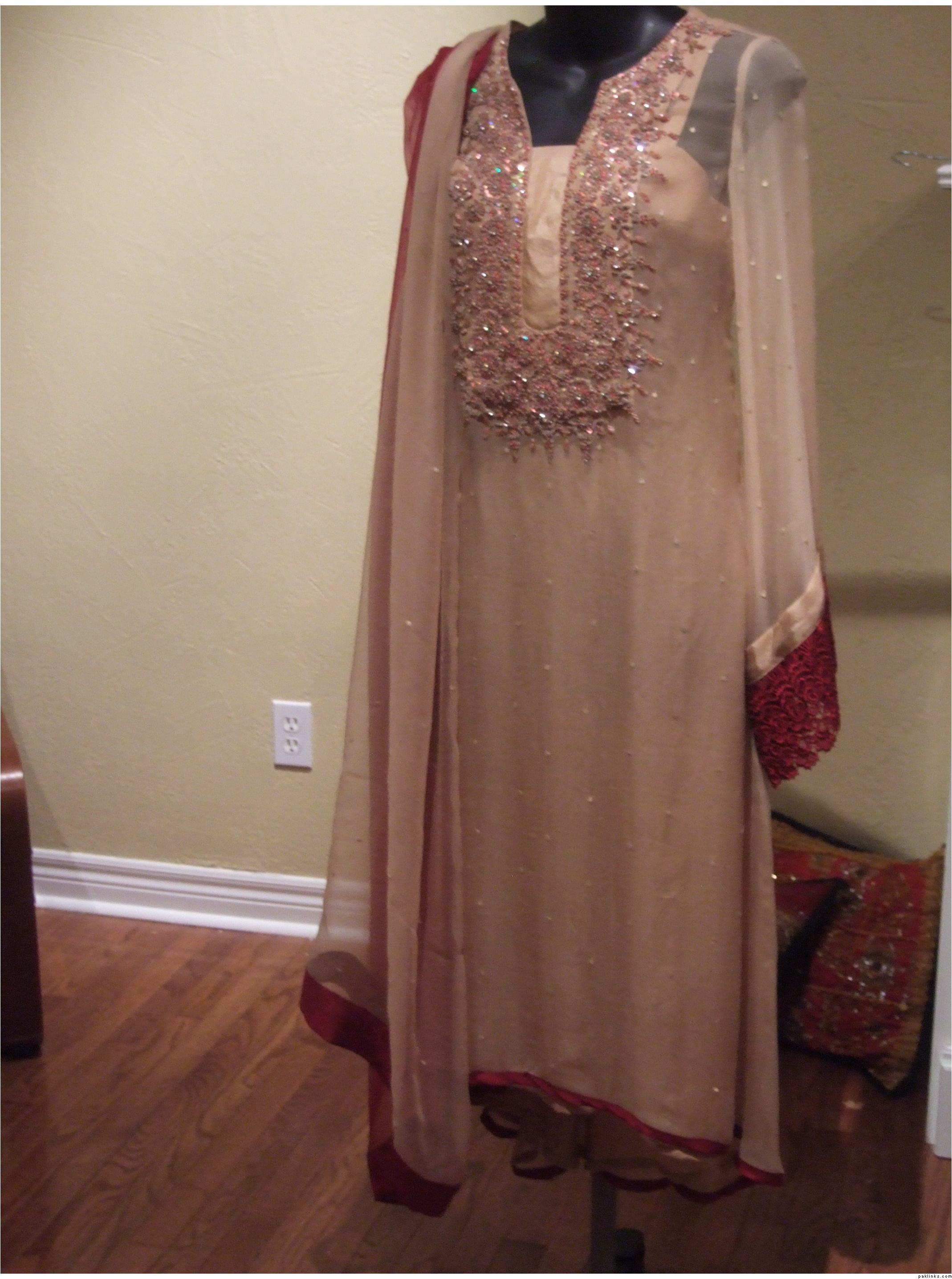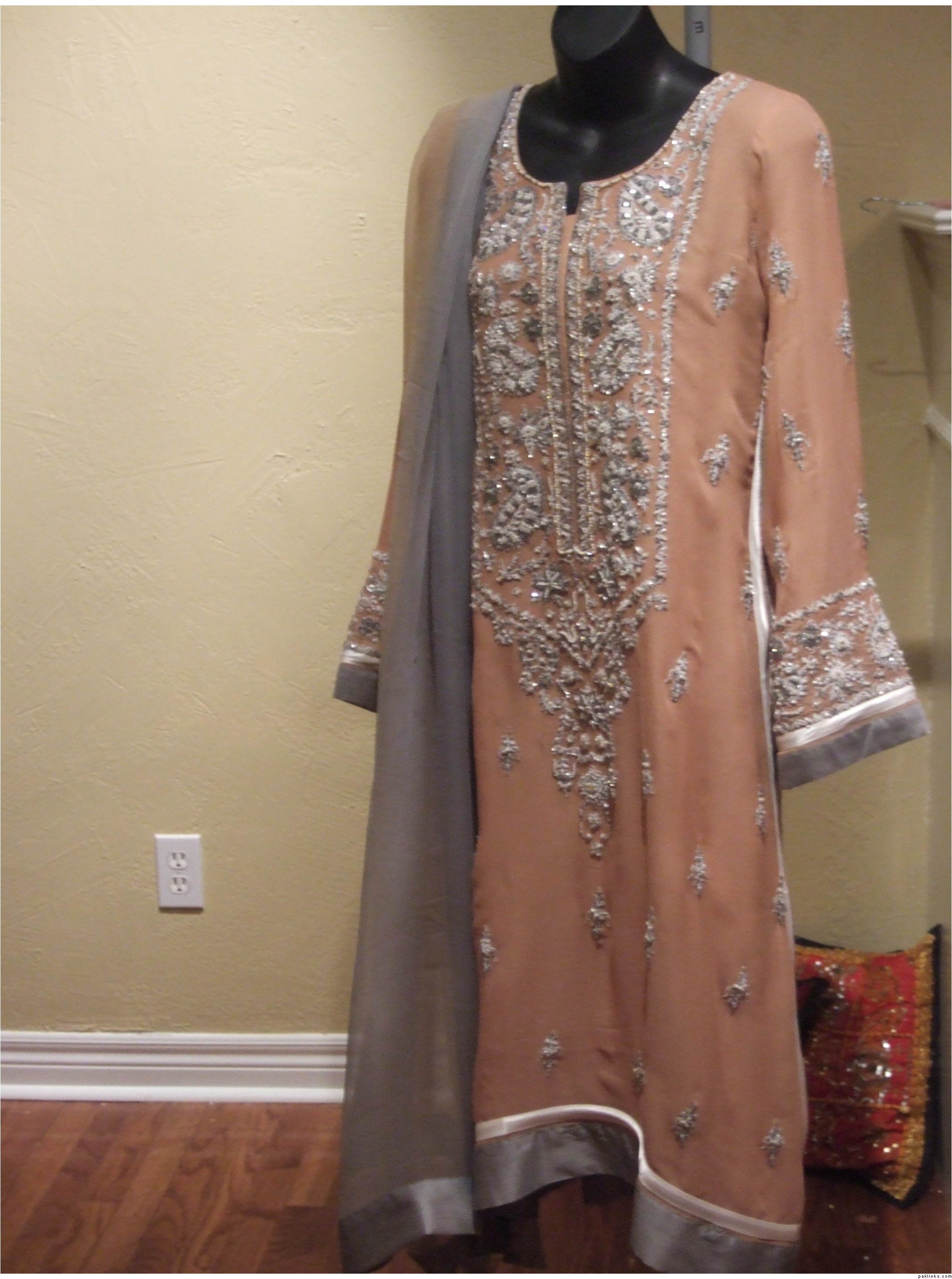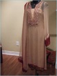 This outfit is available to ship cost $185 has silk pants and chiffon tie and dye dupatta. If you need this right away then you will have to tell me before Friday since I'm leaving the country till Feb 8th. If there's no urgency then I will respond to all queries when I return. You can also email me