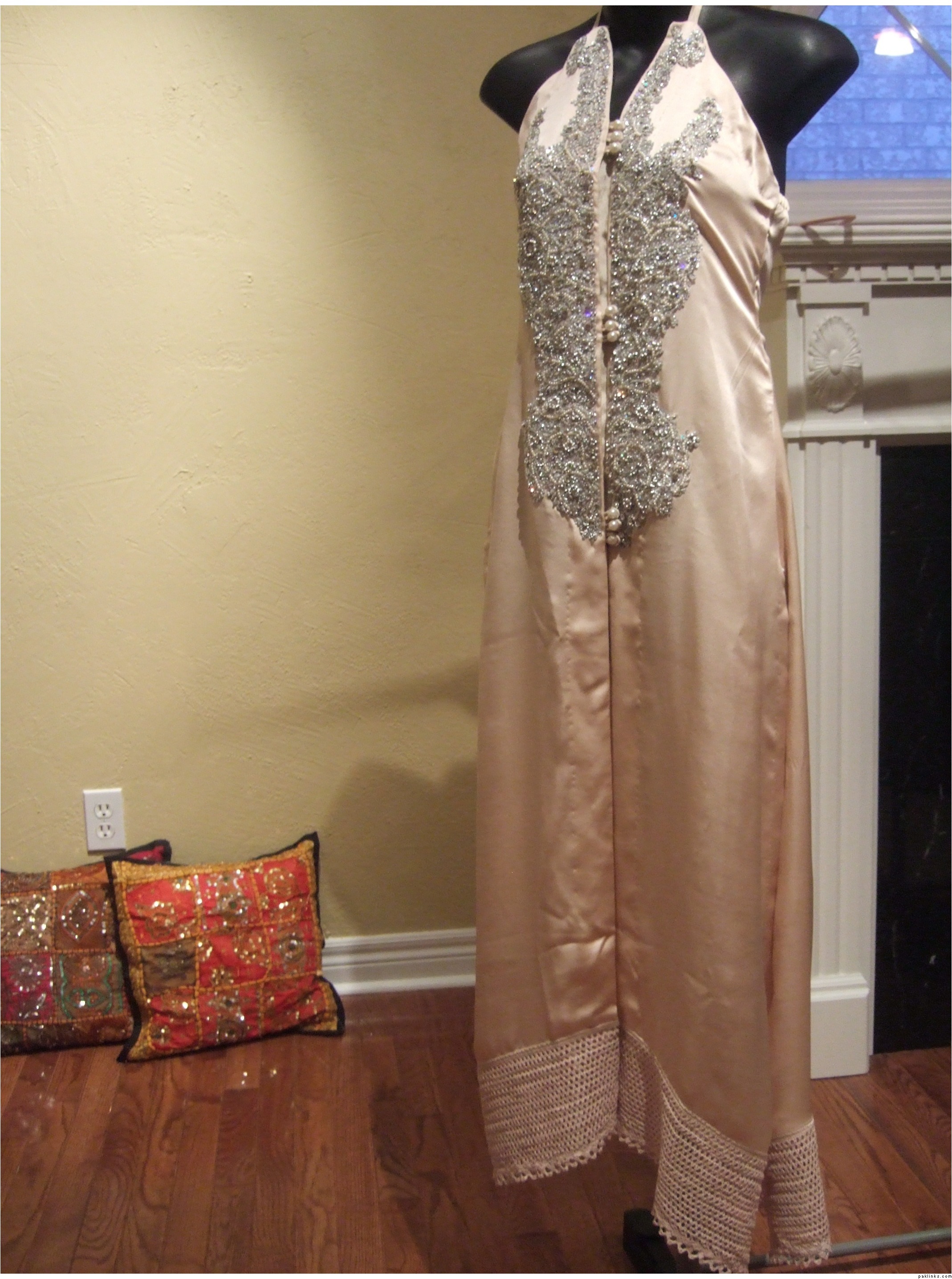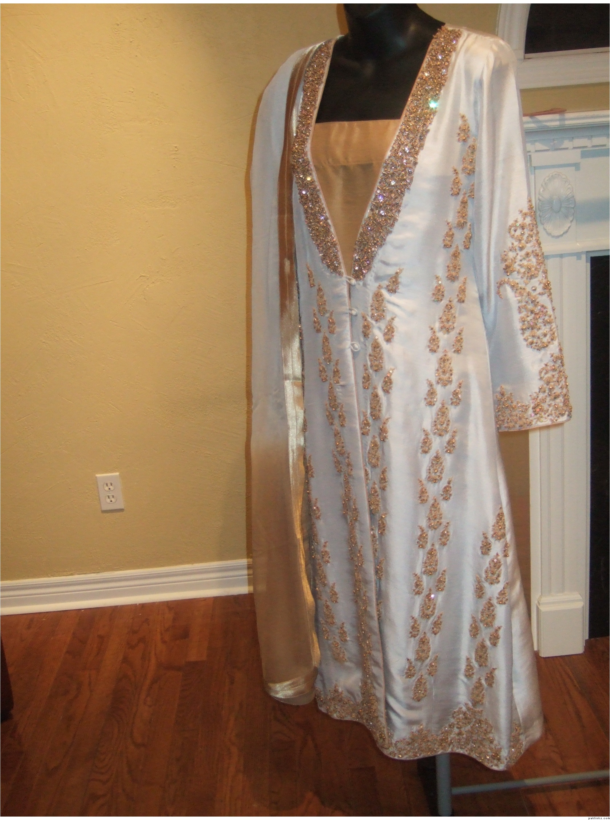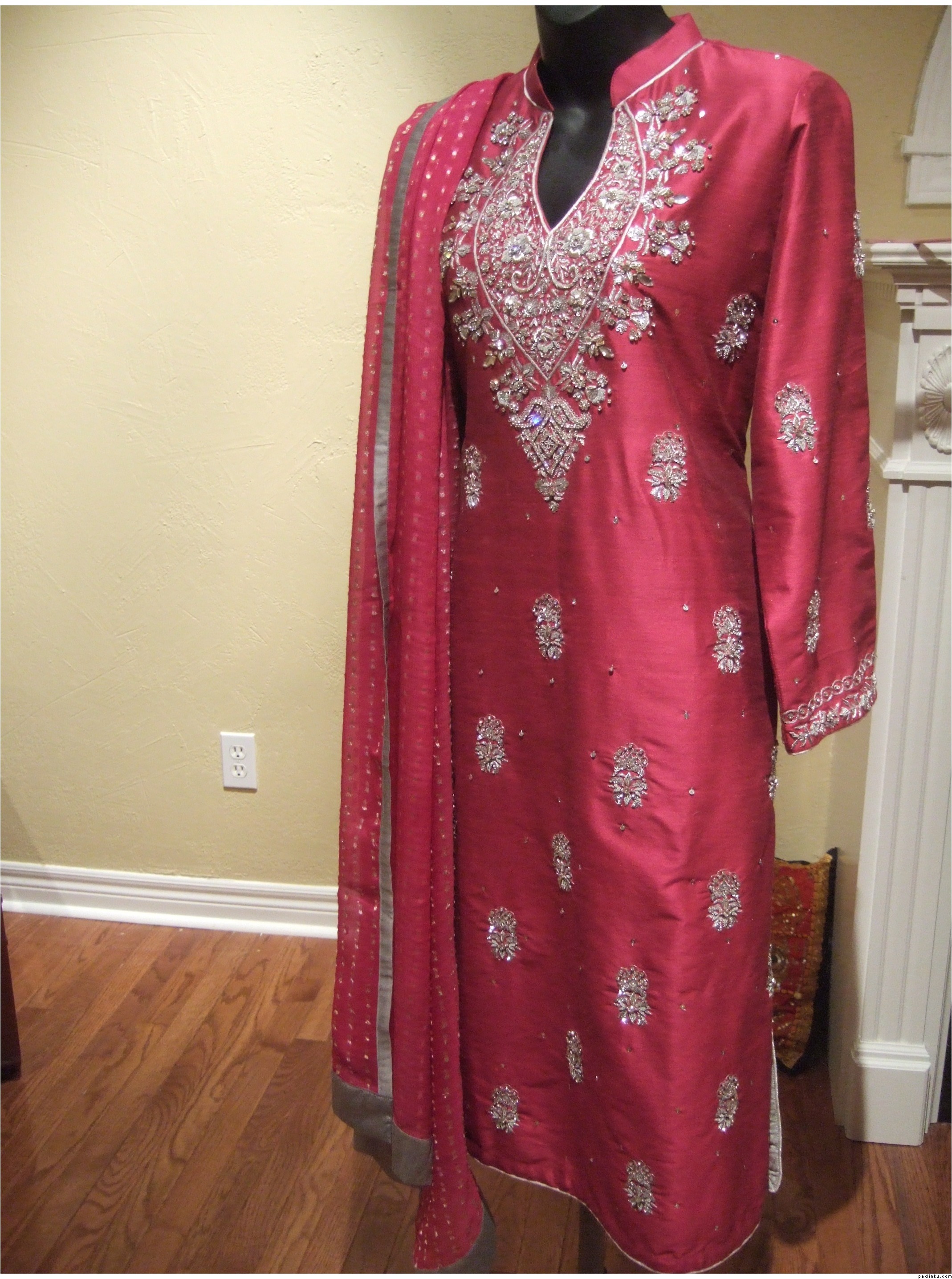 This outfit is available to ship cost $185 has silk pants and chiffon tie and dye dupatta. If you need this right away then you will have to tell me before Friday since I'm leaving the country till Feb 8th. If there's no urgency then I will respond to all queries when I return. You can also email me