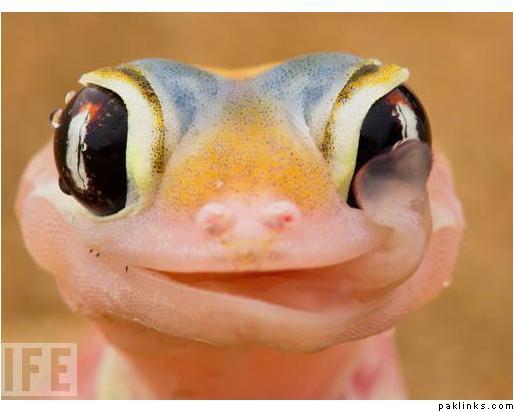A rare, nocturnal web-footed gecko wipes the morning dew from its eyes in the Namibian desert. These geckos collect water on their eyeballs in the early morning; later, they lick it off to have a drink.