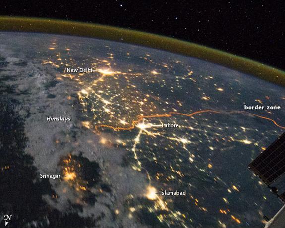 Clusters of yellow lights on the Indo-Gangetic Plain reveal numerous cities large and small in this astronaut photograph of northern India and northern Pakistan. Of the hundreds of clusters, the largest are the capital cities of Islamabad, Pakistan, and New Delhi, India. (For scale, these metropolitan areas are approximately 700 kilometers or 435 miles apart.) The lines of major highways connecting the cities also stand out. More subtle, but still visible at night, are the general outlines of the towering and partly cloud-covered Himalayas to the north (image left).