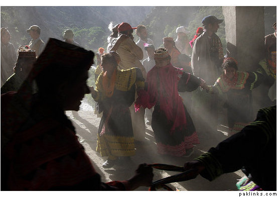 Their gods, like those of the ancient Greeks, are split up into male and female deities and they claim they once belonged to highly literate culture until their books were burned by barbarian tribes. Shown in these pictures celebrating their annual Spring festival, the Kalash still maintain a fertility rite where a teenage boy is sent alone into the surrounding woods for a year and when he returns is treated to a feast and the mating rites to as many of the Kalash women he chooses.
