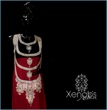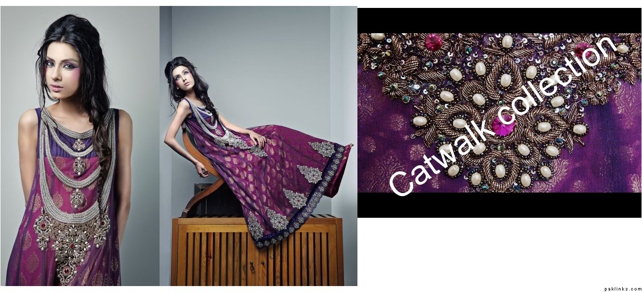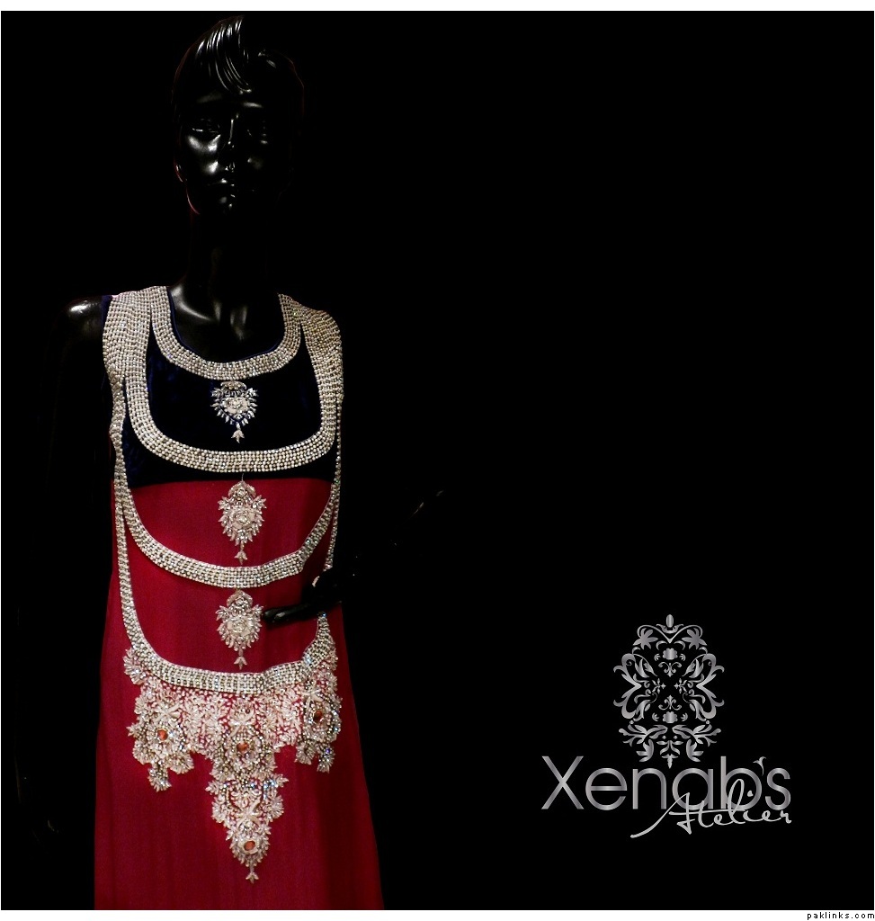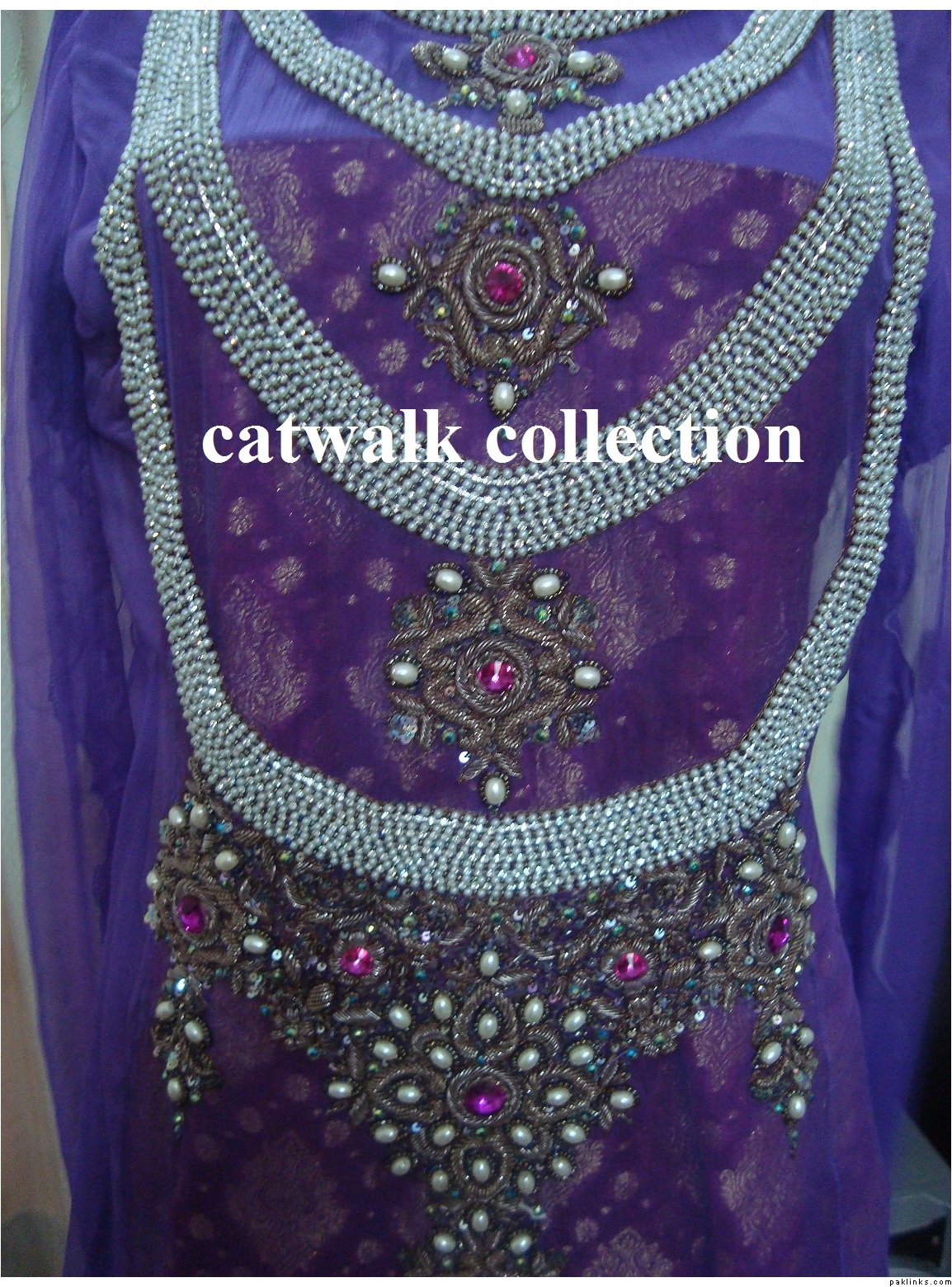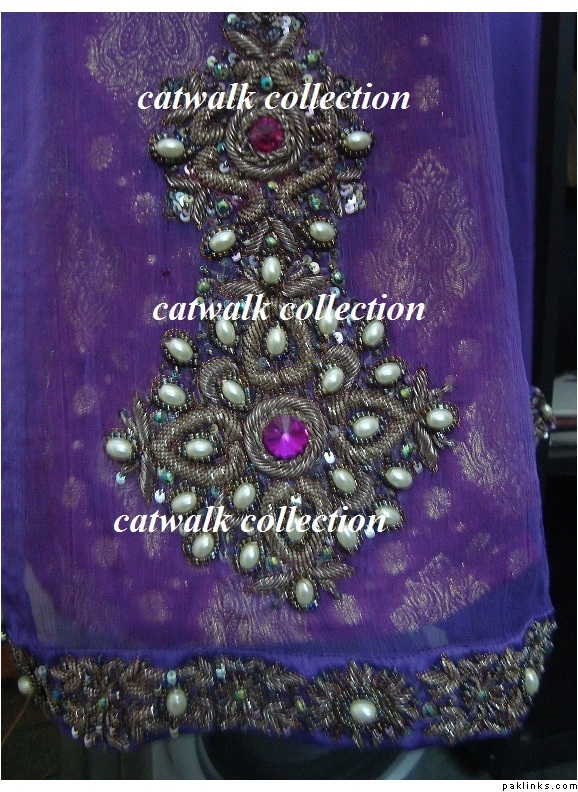 If anyone is offering this outfit in Rs.11000, you can rest assured thats not very high quality work because having this outfit made in zardosi, dabka, and kora would definitely cost the designer themselves a lot more than that, esp when so many pearls and crystals are involved. When a replica designer offers such a small price, always find out what sort of embroidery they’re using, because many replica designers do resort to zari embroidery (silver or gold thread) and plastic stones instead of glass stones to bring the costs down. A dress like this can either be made in naqshi and kora like Catwalk has used on her outfit, or dabka and naqshi like mine to maintain the effect that the original outfit somewhat has
