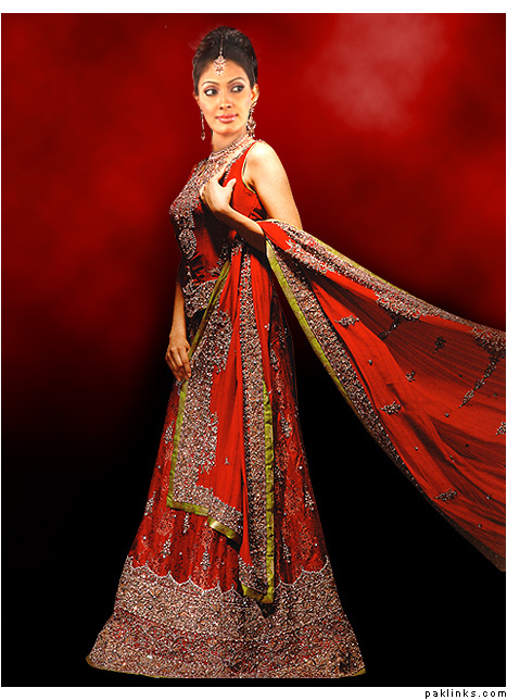 Pakistani fashion model Suneeta Marshall is wearing a lehnga in a cut between mermaid style and A line. This cut has a loosely tapered fitting at the mid-thigh height rather than a tightly tapered fitting at the knees. The result gives a very flattering figure showing off just a few curves.
