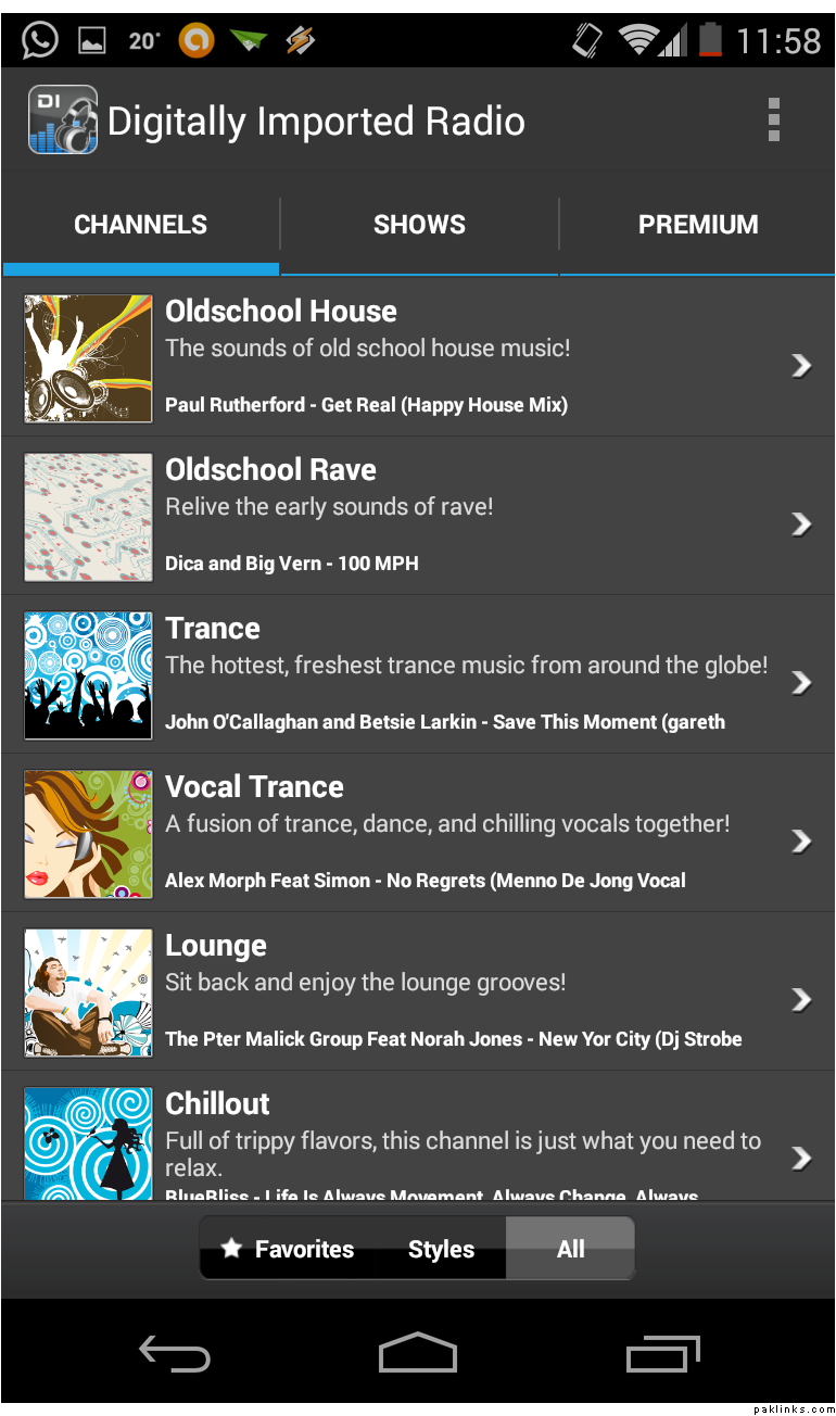 Been listening to music on di.fm for 4-5 years now. The website has a large selection of channels for different kinds of non-mainstream music. Now you get the same electronic music goodness on your phone. They play commercials after every 4-5 songs which can be eliminated if you purchase the pro version. You also get better audio quality with the pro version however the quality on the free version is pretty darn good too.