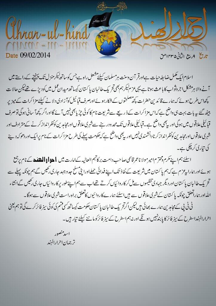 The Ahrar-ul-Hind statement, dated Feb. 9 and written in Urdu, criticizes the decision to focus on the tribal areas. “Some of our leaders have become prey to compromises and have agreed to conduct dialogue only to get the tribal areas liberated,” said Asad Mansoor, a spokesman for the group. “Restricting talks to the tribal areas amounts to neglecting the urban areas and the mujahideen,” he added.
