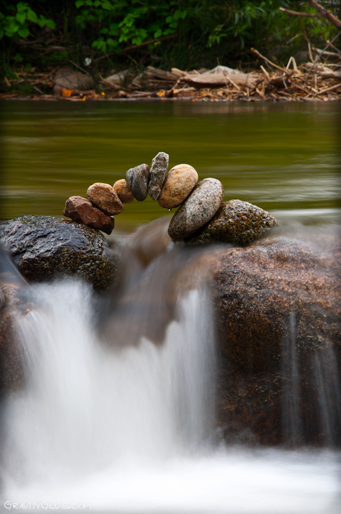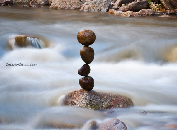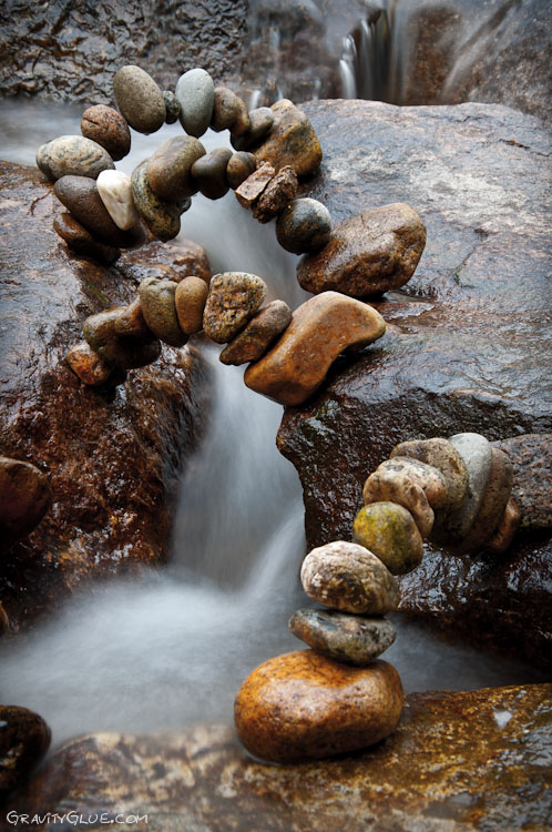 'gravity glue' through the art of 'stone balancing'. According to Grab, the gravity is the only “glue” that holds these structures in equilibrium. His latest collection of sculptures he was doing in the area of Boulder, Colorado. Grab believes that the process of creating these stones sculptures has both spiritual and healing properties. Grab says "The most fundamental element of balancing in a physical sense is finding some kind of “tripod” for the rock to stand on. Every rock is covered in a variety of tiny to large indentations that can act as a tripod for the rock to stand upright, or in most orientations you can think of with other rocks. By paying close attention to the feeling of the rocks, you will start to feel even the smallest clicks as the notches of the rocks in contact are moving over one another."