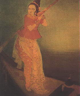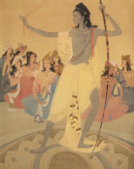 Chughtai’s early watercolours take off from the revivalism of the Bengal School - his Jahanara and the Taj, for instance, shows the influence of Abanindranath’s The Last Moments of Shah Jahan. By the 1940s he had created his own style, strongly influenced by Islamic art traditions, but retaining a feel of Art Nouveau. His subject matter was drawn from the legends, folklore and history of the Indo-Islamic world, as well as Punjab, Persia and the world of the Mughals.