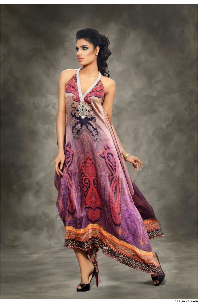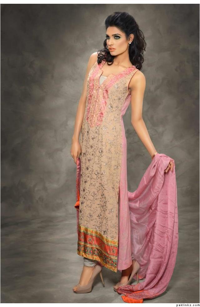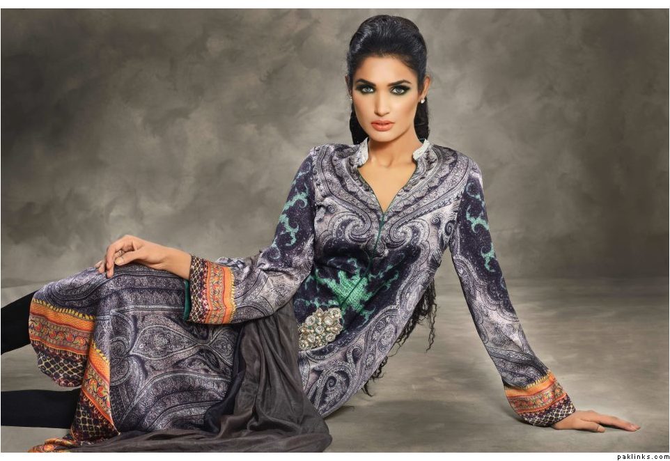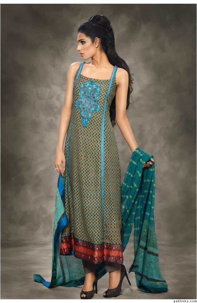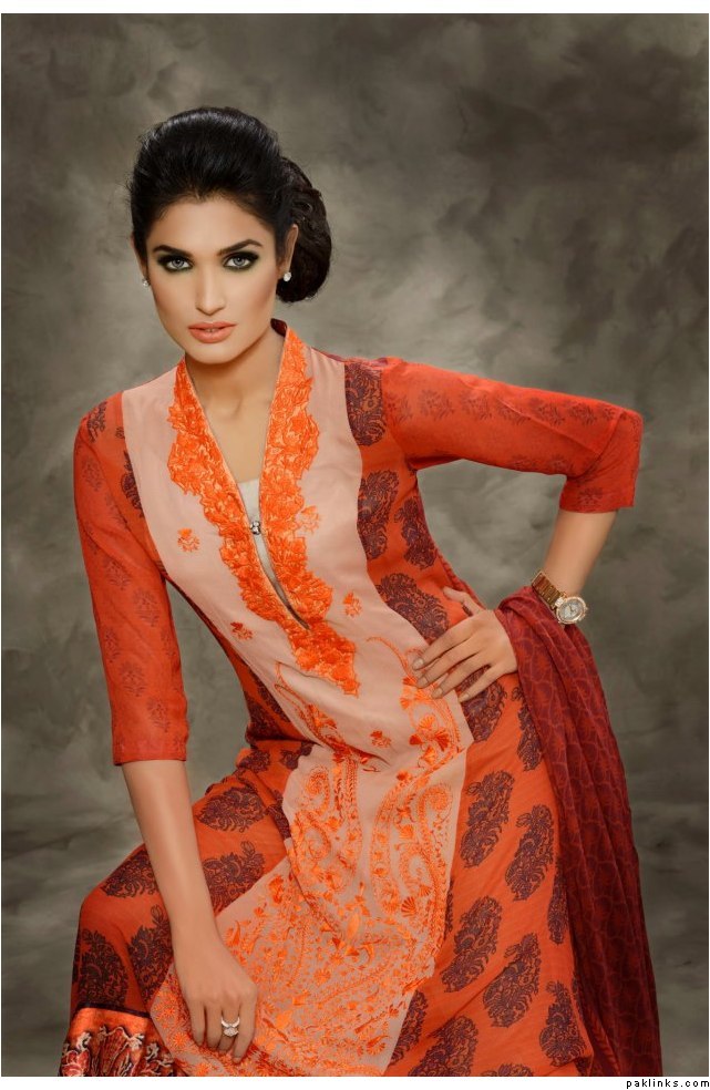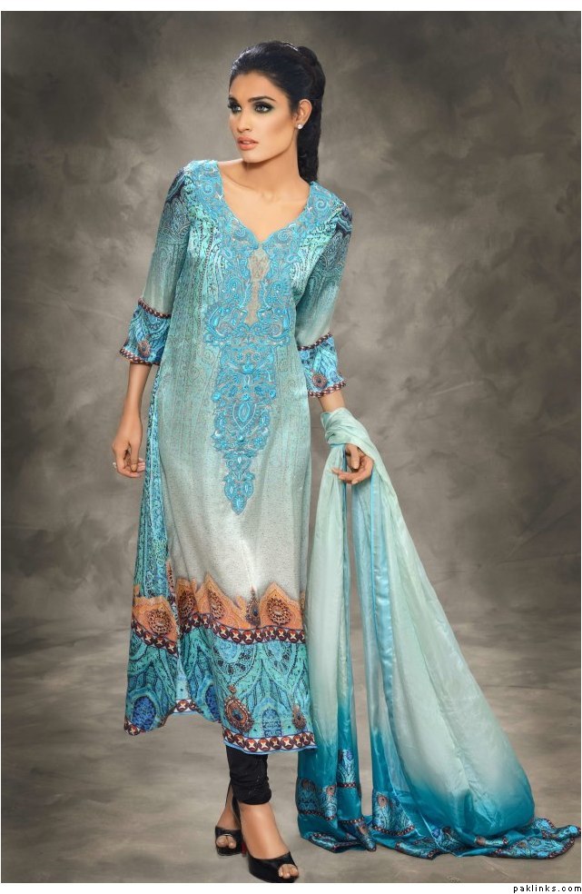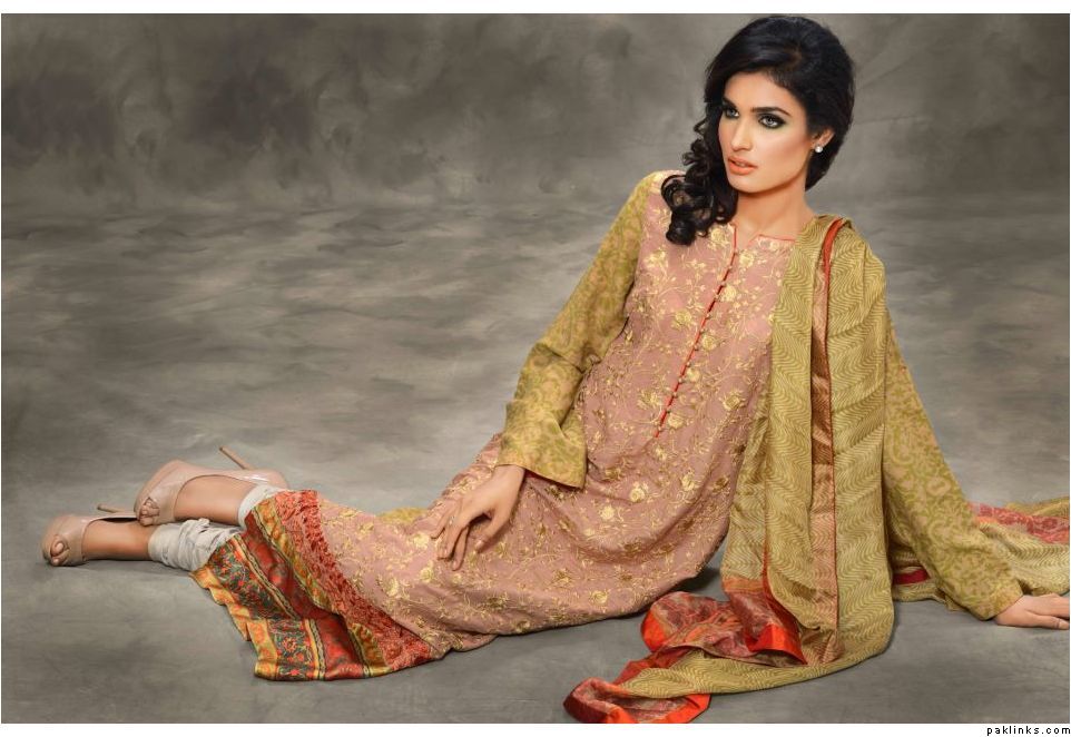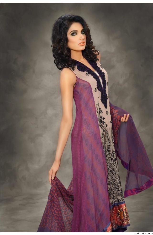 The collection is a combination of heavy thread work on chiffons and katan ka***** along with swarovskis embellished attachments. Also comes with printed pure satin silk and pure chiffon Material. The total collection comprises of 7 designs with two color options, with two-piece and three-piece suits .