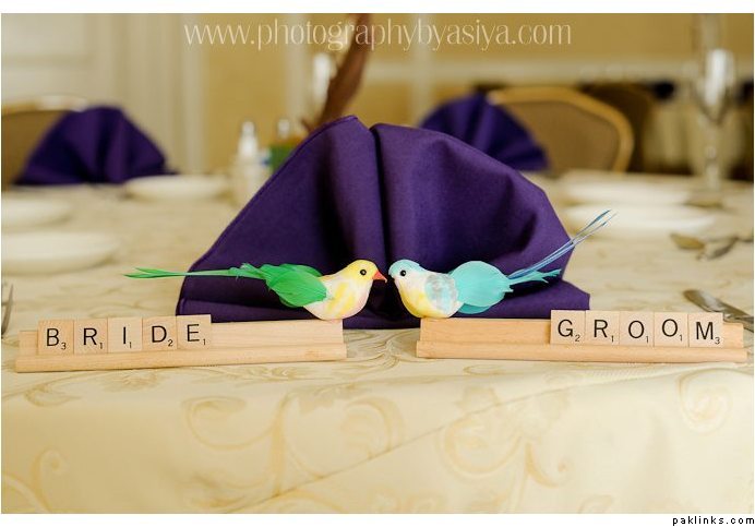 Wow! Interesting idea. Not too keen on the green though. Her bouquet is interesting too. I love the birds and scrabble tiles though.