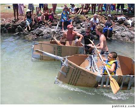 The seniors in the AP Physics class do an end-of-the-year competition each year just for fun. This year we have to build a boat out of nothing but cardboard, trash bags, and duct tape (unlimited). Our school is by the water so on the last day (this Thursday) we are all going to take our boats down and one person from each team is going to sit in the boats and actually row it about 40 meters out to a flag post. The team that captures the flag first wins.