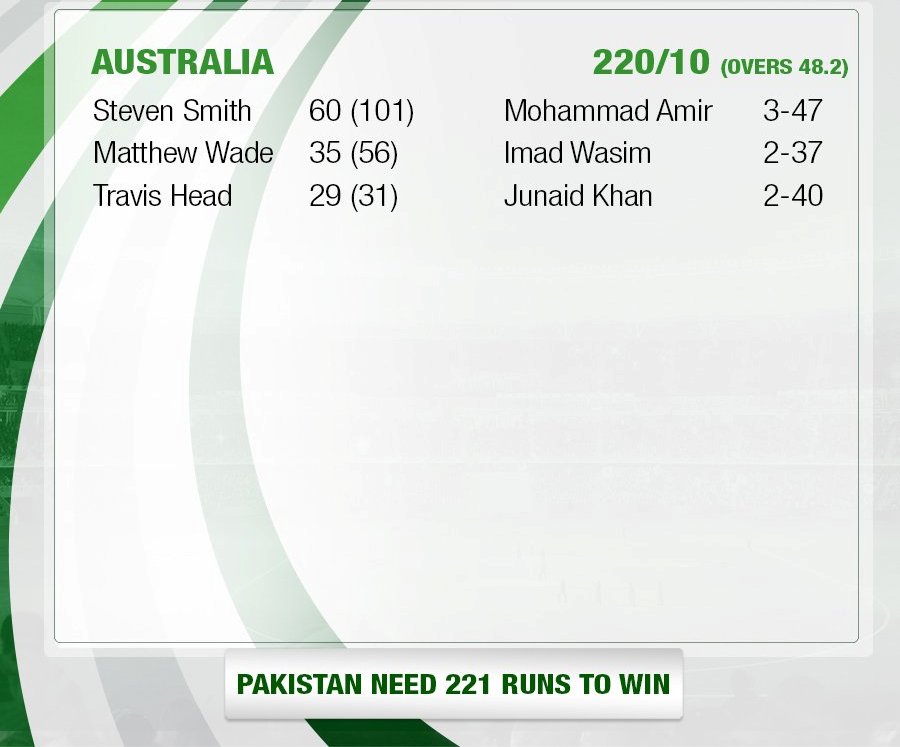 Pakistan (possible) 1 Mohammad Hafeez (capt), 2 Sharjeel Khan, 3 Babar Azam, 4 Asad Shafiq, 5 Umar Akmal, 6 Mohammad Rizwan (wk), 7 Imad Wasim, 8 Mohammad Nawaz 9 Mohammad Amir, 10 Wahab Riaz, 11 Hasan Ali.