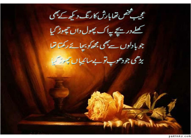**Kuch Dayr Aik Chup Si Rahi Darmyan Mein ** Girhayein Si Jaisay Parnay Lagi Hon Zuban Mein Tum Peechay Hatnay Walay thay, Janay K Wastay Ankhayein Jhuka Rahay Thay, churanay K WAstay Yuk Dum Gira Tha Phool Koi Shakhsaar Say Dekha Tha Tum Nay Meri Taraf Iztarar Say Barish Mein Bheegtay Huway Jhonkay Hawa K Thay
