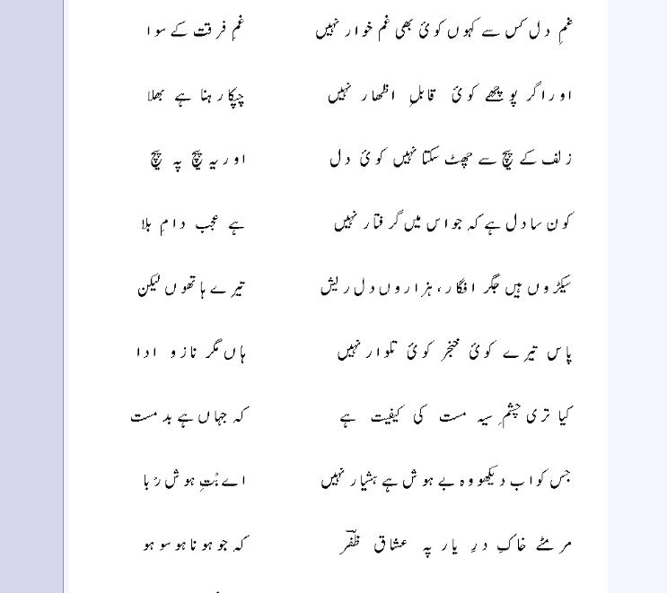 maiN aaj aapkii Khidmat meN Bahaadur Shaah “Zafar” kii “deRh iiNTii Ghazal” [yeh merii istilaaH hai :D] pesh kar rahaa huuN. Hairaan na hoiye. yeh ek poorii Ghazal AUR koii dusrii AADHI Ghazal nahiiN hai balki qissa yeh hai ki yeh ek sinf-e-suKhan hai jo Ghazal goyii kii ek aisii haiyat hai jis meN ek lambii behr kii Ghazal aur uske saath saath hii ek dusri chhoTi bahr kii Ghazal motavaazii kahii jaatii hai…neez, jis meN do alai’da alai’hda radeef aur qaafiya hote haiN. maiN jo kah raha huN vo aapko yeh Ghazal paRh kar bakhoobhi andaaza ho jaayega. maze kii baat to yeh hai ki donoN GahzloN meN baa_ham rabt o zabt baRa hii dil-chasp aur ustuvaar hota hai.