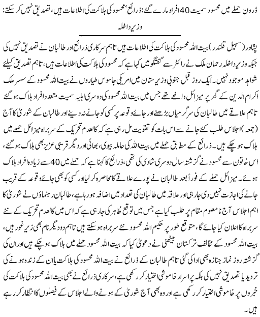 The United States has placed a $5m reward on the head of Mehsud and correspondents say that his death, if confirmed, would be a major boost to its efforts to eradicate the Taliban in Pakistan.