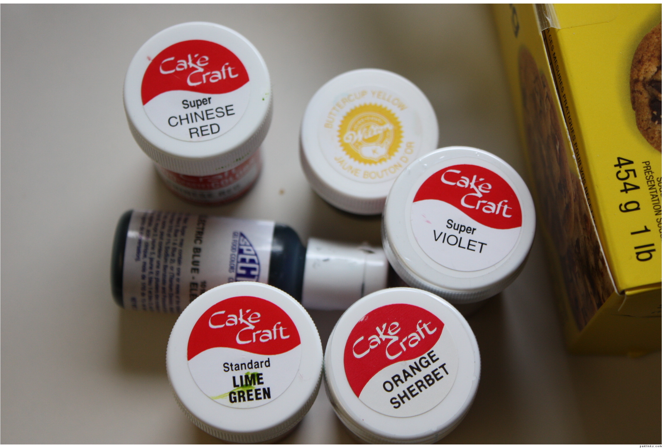 Colours. I used Wilton’s Buttercup Yello and a liquid Electric Blue colour by Spectrum. I was really disappointed with the Wilton colour cause it actually looked more brown than yellow. Next time, I will just stick to the Cake Craft yellow shade I purchased.