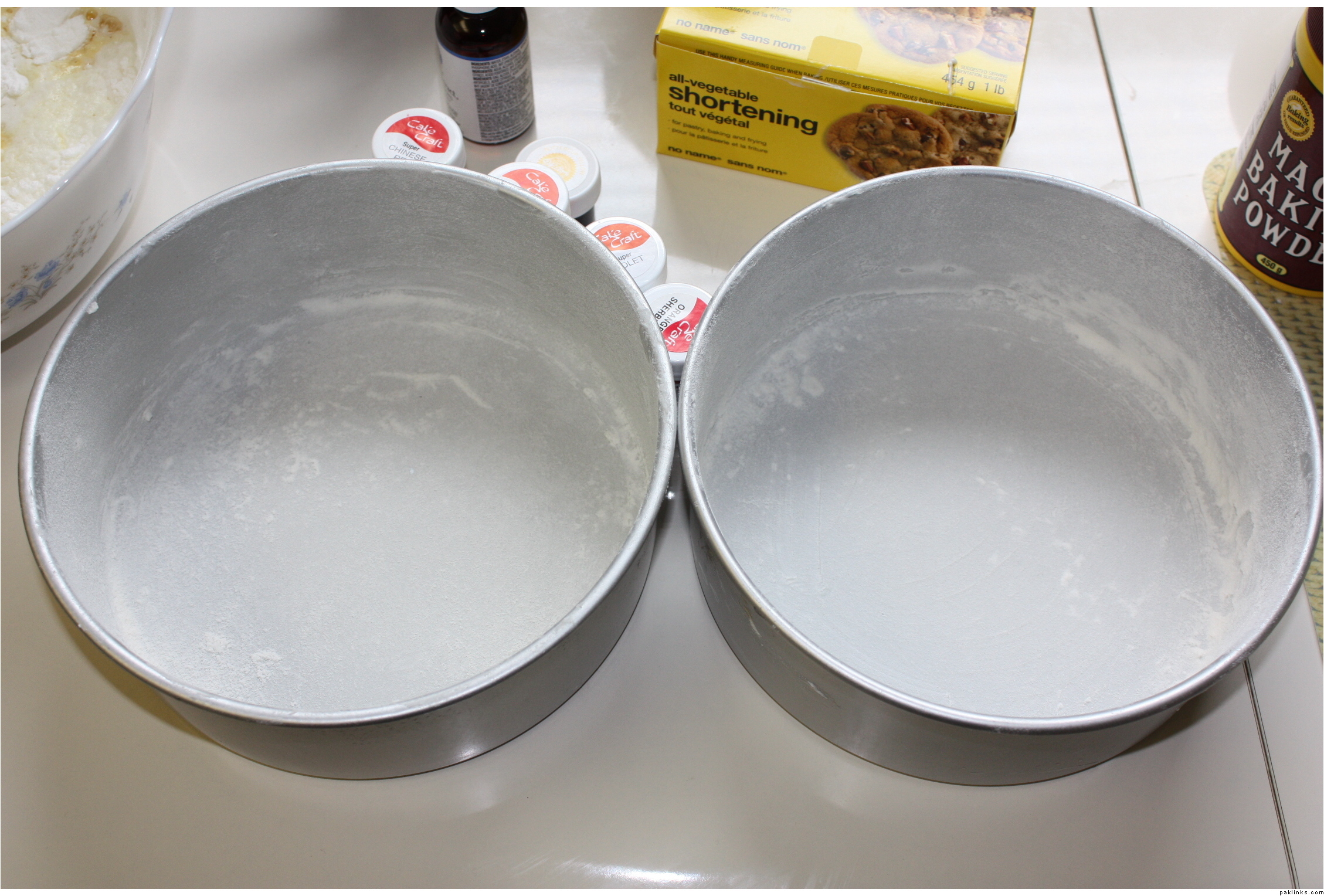 Shortening covered and flour dusted 8" pans ready for the cake batter.