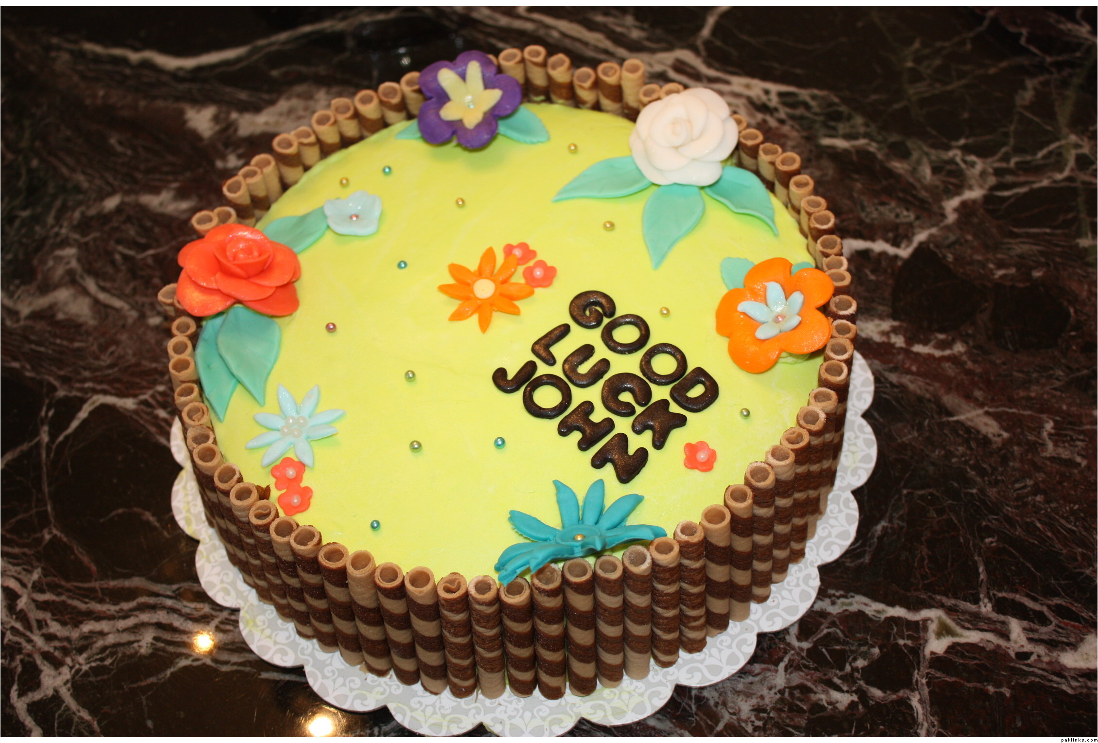 i made my ‘farewell’ cake for my boss. he’s going to the caribbean to do charity work. so i wanted to make a tropical looking cake. i got inspiration from sunset_eyes cakes and decided to use cigarellos around the border, to give it a bamboo effect. Out of all the cakes I have made so far, this one is my favourite.