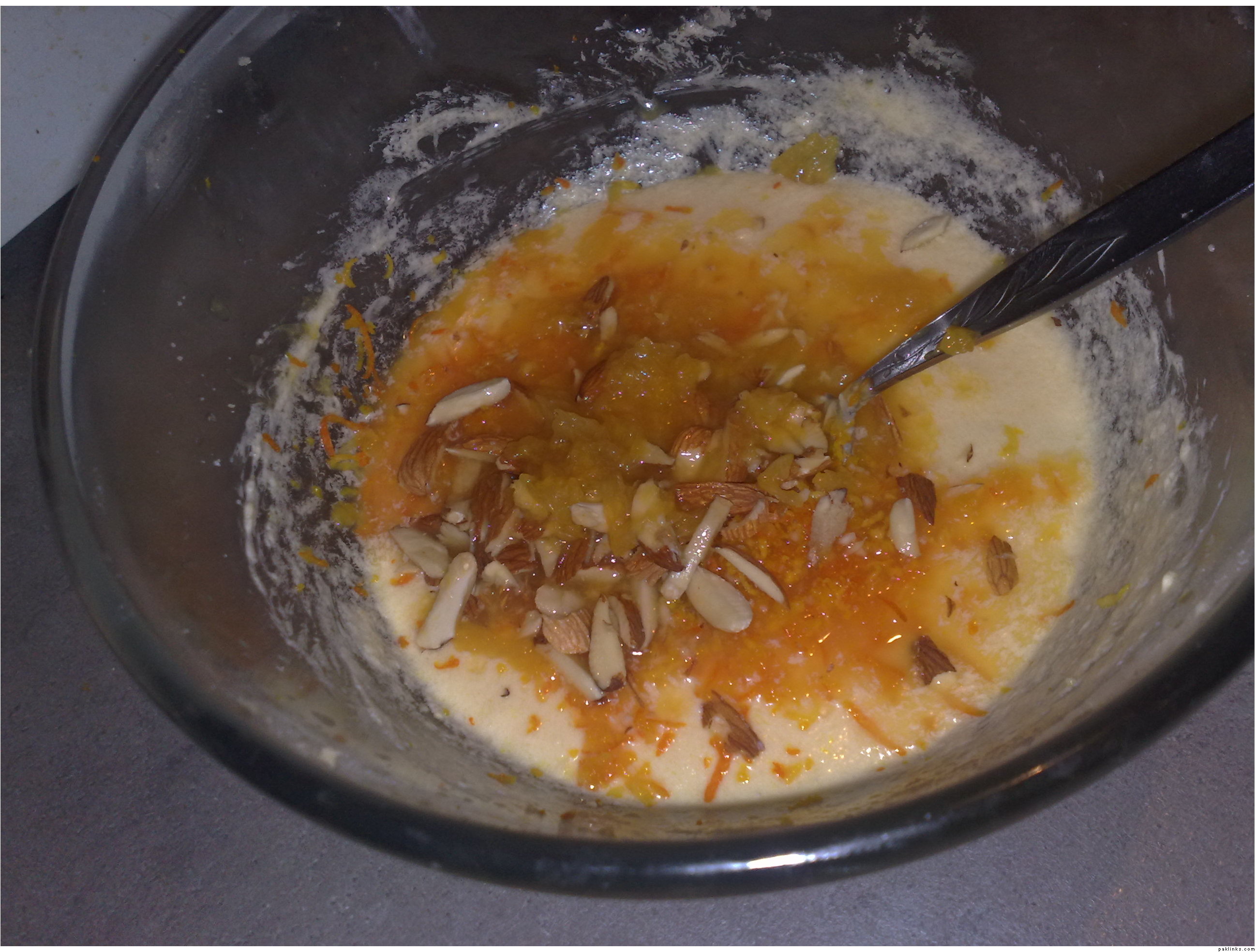 Add orange zest, juice and almonds. At this point you can add anything you desire- cocoa powder and chocolate for a chocolate cake, dried fruit etc.