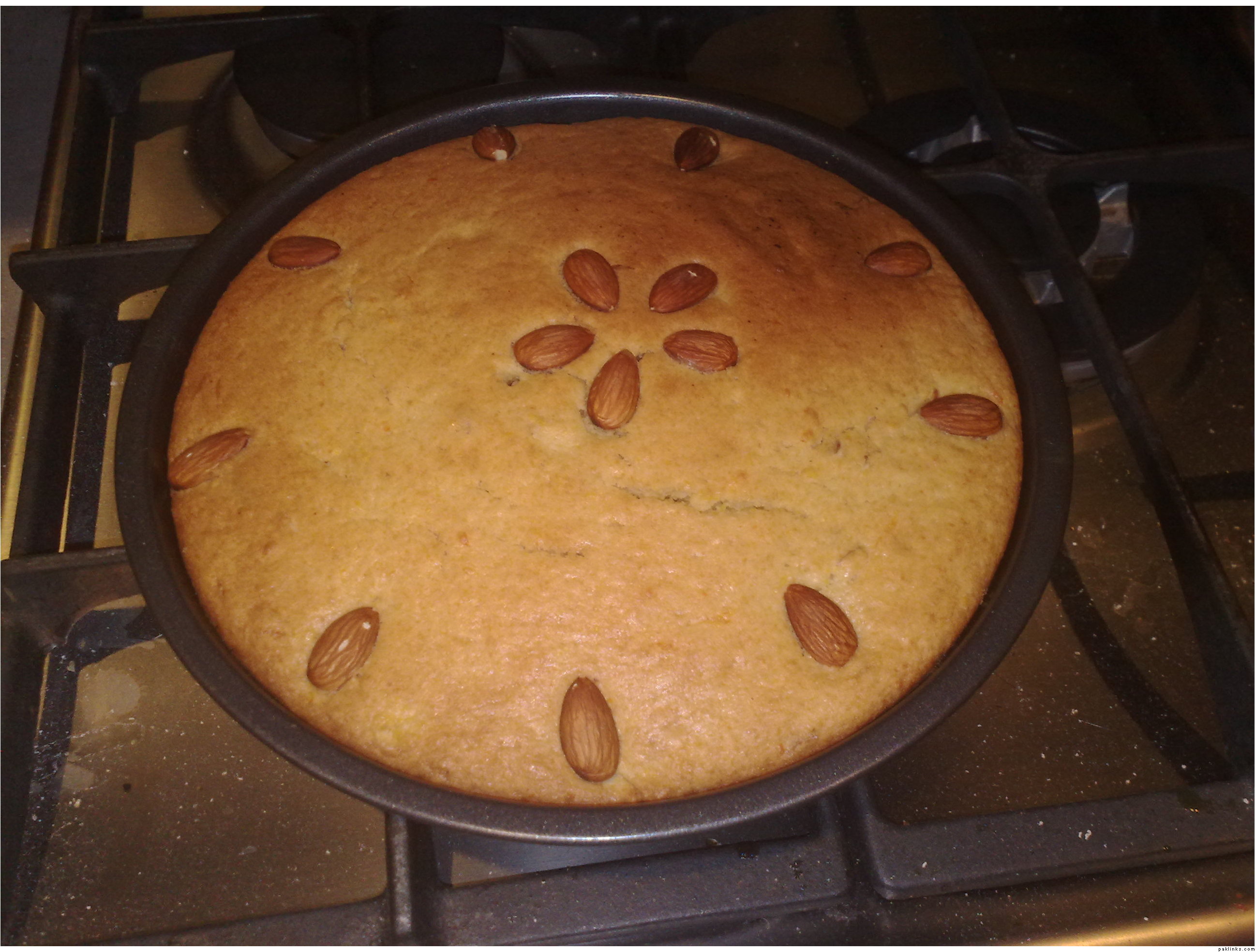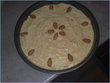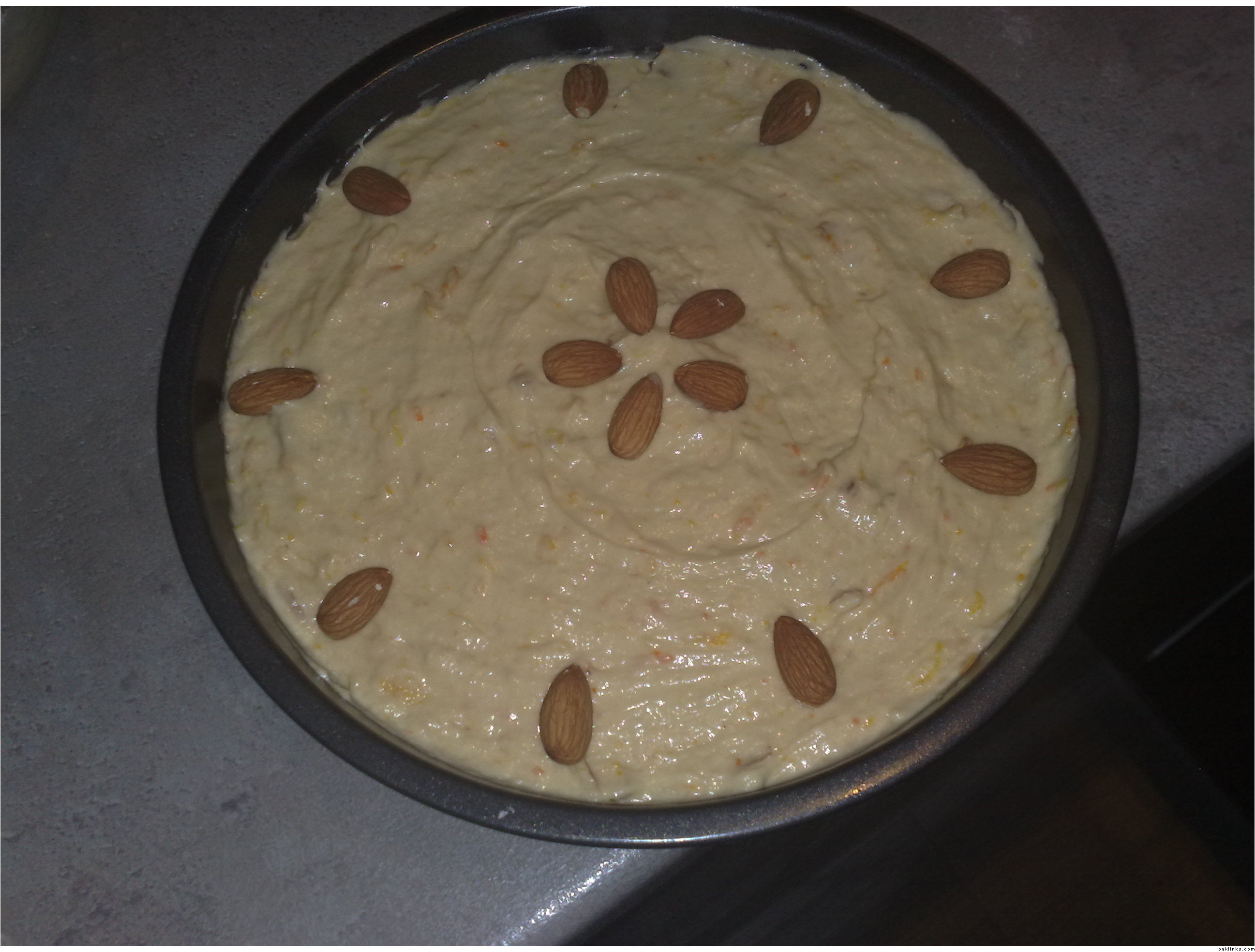 Transfer to a baking tin. If using almonds as decoration, do not poke them into the cake mixture, just place them on the surface.