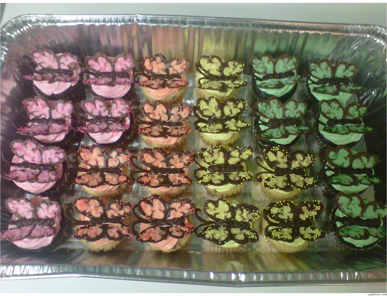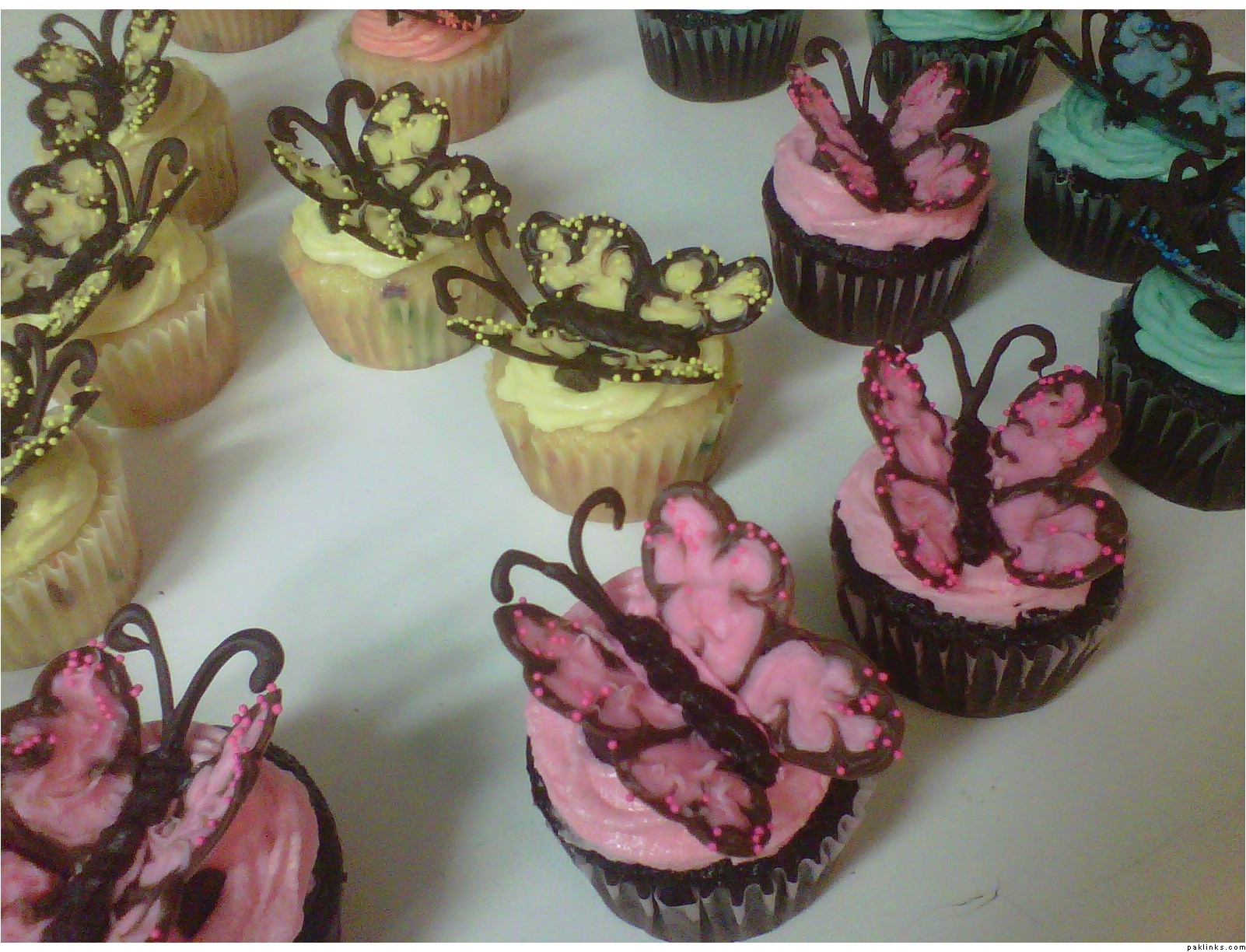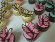 Thanks! My sister made the butterflies, she used candy melts. So basically she drew the butterfly halves onto wax paper and refrigerated them and then once they were cooled pulled them off and we added them onto the cupcakes. Since they are heavy we added a chocalate chip under each wing for support. For the inside colored part we mixed some food coloring with white candy melts. Hope it makes sense, if not please let me know.