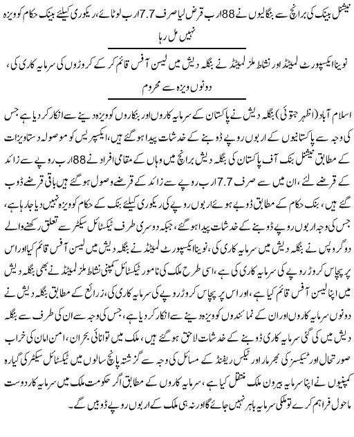 National Bank is a joke when it comes to getting loans on political basis. Pakistanis have been looting it for far too long. No problems agar Bangladeshi bhi behti Jamna mein haath dho lain. Of course, Mian Mansha has political connections too. Serves him right to set up industry in Bangladesh instead of influencing policy makers in Pakistan.