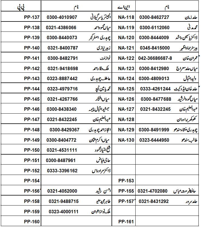 The PTI candidates from Lahore, for the National Assembly, include Hamid Zaman (NA-118), Mohammad Madni (NA-119), Dr Yasmeen Rashid (NA-120), Barrister Hammad Azhar (NA-121), Imran Khan (NA-122), Mehmoodur Rasheed (NA-126) and Abdul Aleem Khan (NA-127).