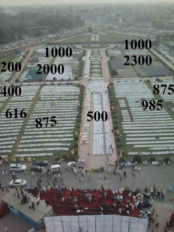 10,000 people on seats, 20,000 standing… at most there were 30,000 people from all over Pakistan, being active in Lahore in 90s when political activities ( Jalsas and rallys) were norms ( because of Benazir and Qazi Hussain Ahmed) this jalsa would have been considered a failure. But special thanks to Pervaiz Musharaf who got us in a unnecessary war and have created an environment of fear and terrorism, people fear to take part in these activities…