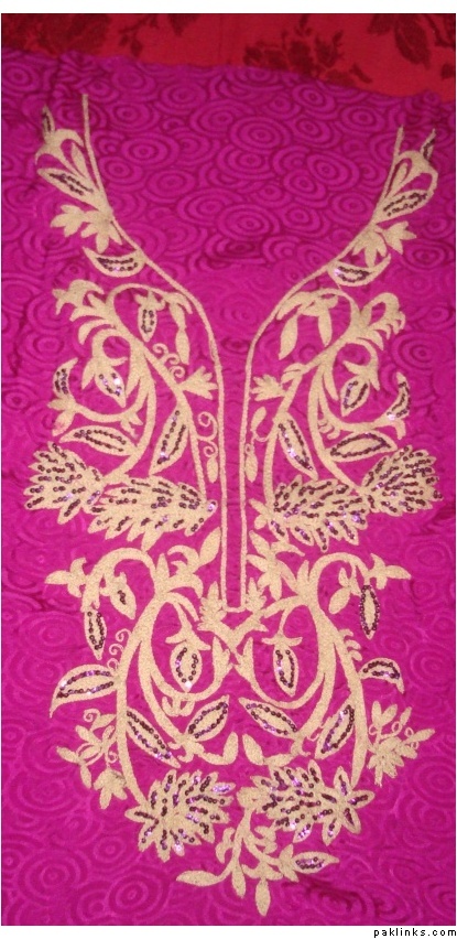 here is it: (this is the neckline only. it has a 4 inches border on sleeves as well) and dupatta is tied&dyed with ribbon piping all around.
