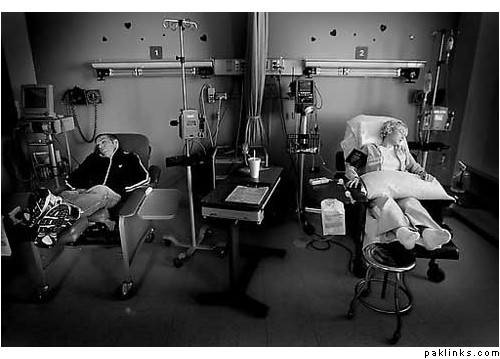 In the picture, Nick is waiting for her on one of the many sessions of chemo to end.