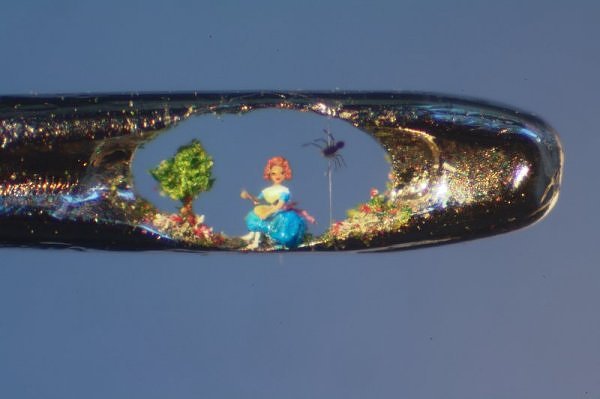 With some of his pieces so infinitesimal they rest tenuously on the tip of a human eyelash, it’s perhaps small wonder that Wigan’s work has had its mini-catastrophes. He once lost a sculpture of Alice in Wonderland as he was moving her to a needle; she simply disappeared, inhaled perhaps in Wigan’s own breath. Yet there are also great highs in what he does – not least people’s astonishment when they see the miniscule fruits of his labour for their own eyes.