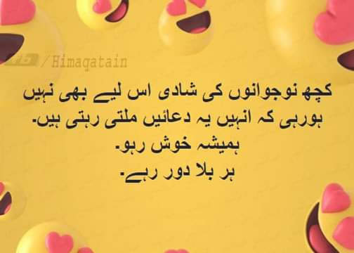 ایک نیا شادی شدہ جوڑا مرنے کے بعد جنت میں گیا اور وہاں جا کر فرشتے سے کہا کہ ہماری یہاں بھی شادی کرواؤ فرشتے نے اُن سے 5 سال کی مہلت مانگی اور 5سال بعد ان کا نکاح کروا دیا۔ دس دن کے بعد دونوں میں لڑائی ہو گئی اور فرشتے سے کہا کہ اب ہماری طلاق کرواؤ۔ فرشتہ نے کہااؤے خدا کا خوف کرو!! پہلے ھی میں نے جنت میں 5 سال محنت کے بعد ایک مولوی ڈھونڈا تھا۔۔۔ اور اب تم جنت میں وکیل مانگتے ہو۔۔۔ نا ممکن ھے بھائی !!۔۔۔۔۔۔۔۔۔