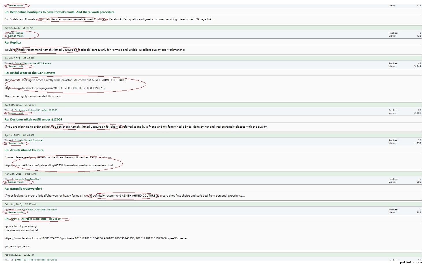 The fact that the ONLY time you post to is to compliment/recommend Azmeh Ahmed Couture seems to be clear indication that you are either Azmeh or you work for Azmeh. Quite frankly, even if someone was interested in ordering from her, that you surreptitiously up-vote your own brand is such a turn-off (makes it seem like no one else ever orders from you/her) and in turn discourages others from ordering from Azmeh.