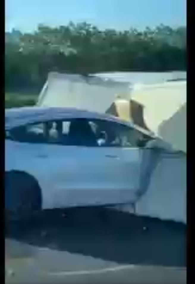 a Tesla Model 3 came into the picture driving in the inside-most lane straight for the truck. Despite the truck downed on the highway in the middle of a clear and sunny day,