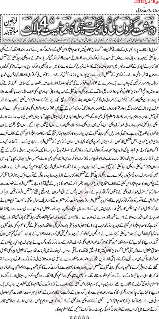 For instance, I have 1000s of relatives living in Karachi, all of them are educated and most of them are professionals working in Pakistan or abroad. Many are PhDs, Medical doctors, Engineers, MBAs, CAs, Bankers, Managers, Lawyers, Bureaucrats, and even Businessmen. If there was truth that MQM takes Bhatta and kill, then I would have heard the stories too, alleging MQM. Unfortunately, what I know is that it is not MQM but it is mostly PPP and ANP who are collecting Bhatta, killing innocent (not political opponents but innocent civilians), and also grabbing lands.