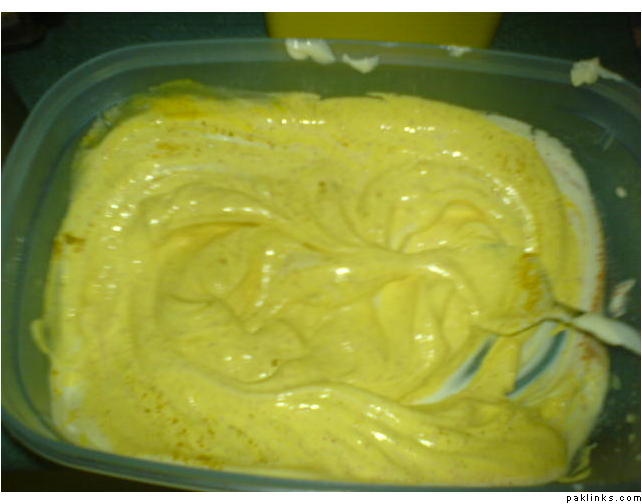 Separately mix 2 cups of yougurt with 1 tbsp of red chilli powder 1 tbsp salt and some saffaron