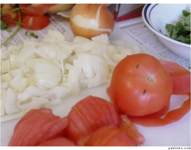 Chop 2 onions finely and tomatoes as well