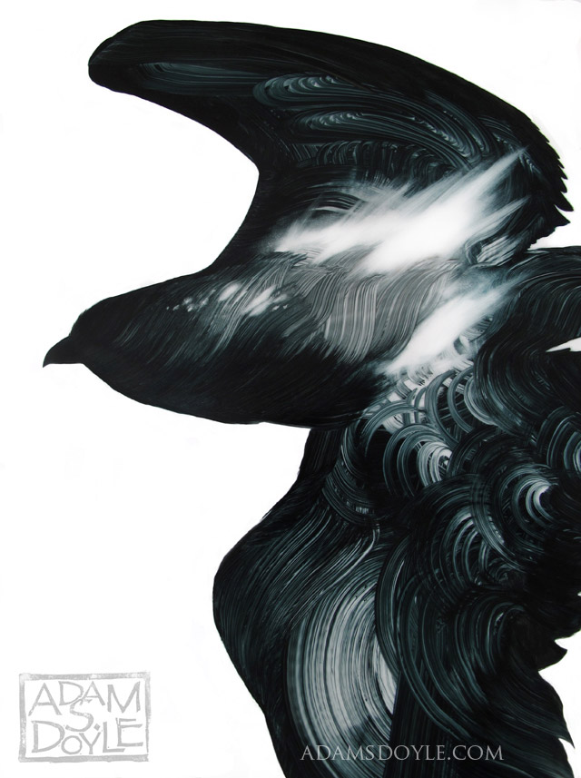 Artist Adam S. Doyle who recently relocated to Hong Kong creates beautiful gestural paintings of birds, where the seemingly incomplete brushstrokes form the feathers and other details of the animal. In some strange way it reminds me of the story of the Renaissance painter Giotto who is rumored to have been able to draw a perfect circle without the aid of a compass, as if Doyle just picks up a dripping paint brush and in a few seconds paints a perfect bird. In reality his work demonstrates a profound control of the paintbrush and careful understanding of the mediums he works with