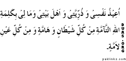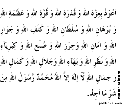 *A-O’OD’U BI-I’ZZATILLAAHI WA QUDRATILLAAHI WA QUWWATILLAAHI WA A’Z’MATILLAAHI WA BURHAANILLLAAHI WA SULT’AANILLAAHI WA KANAFILLAAHI WA JAWAARILLAAHI WA AMAANILLAAHI WA H’IRZILLAAHI WA S’UN-ILLAAHI WA KIBRIYAA-ILLAAHI WA NAZ’ARILLAAHI WA BAHAA-ILLAAHI WA JALAALILLAAHI WA KAMAALILLAAHI WA JAMAALILLAAHI LAA ILAAHA ILLALLAAHU MUH’AMMADUN RASOOLULLAAHI MIN SHARRI MA AJIDU