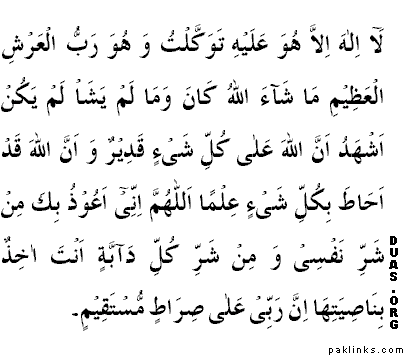*LAA ILAAHA ILLAA HUWA A’LAYHI TAWAKKALTU WA HUWA RABBUL A’RSHIL A’Z’EEM MAA SHAA-ALLAAHU KAANA WA MAA LAM YASHAA LAM YAKUN ASHHADU ANNALLAAHA A’LAA KULLI SHAY-IN QADEER WA ANNALLAAHA QAD AH’AAT’A BIKULLI SHAY-IN ILMAA ALLAAHUMMA INNEE A-O’OD’U BIKA MIN SHARRI NAFSEE WA MIN SHARRI KULLI DAABBATIN ANTA AAKHID’UM BINAAS’IYATIHAA INNA RABBEE A’LAA S’IRAAT’IM MUSTAQEEM